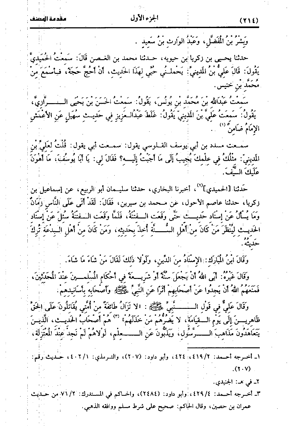 حَدَّثَنَا الْحُمَيْدِيُّ، أَخْبَرنا البُخارِيّ، حَدَّثَنا سُلَيْمَانُ أَبُو الرَّبِيعِ عَنْ إِسْمَاعِيلَ بْنِ زَكَرِيَّا، حَدَّثَنَا عَاصِمٌ الأَحْوَلَ، عَنْ مُحَمد بْنِ سِيرِين فَقَالَ: لَقَدْ أَتَى عَلَى النَّاسِ زَمَانٌ وَمَا يُسْأَلُ عَنْ إِسْنَادِ حَدِيثٍ حَتَّى وَقَعَتِ الْفِتْنَةُ، فلما وَقَعَتِ الْفِتْنَةُ سُئِلَ عَنْ إِسْنَادِ الْحَدِيثِ، لِيُنْظَرَ مَنْ كَانَ مِنْ أَهْلِ السُّنَّةِ أُخِذَ بِحَدِيثِهِ، ومَنْ كَانَ مِنْ أَهْلِ الْبِدْعَةِ تُرِكَ حَدِيثُهُ.