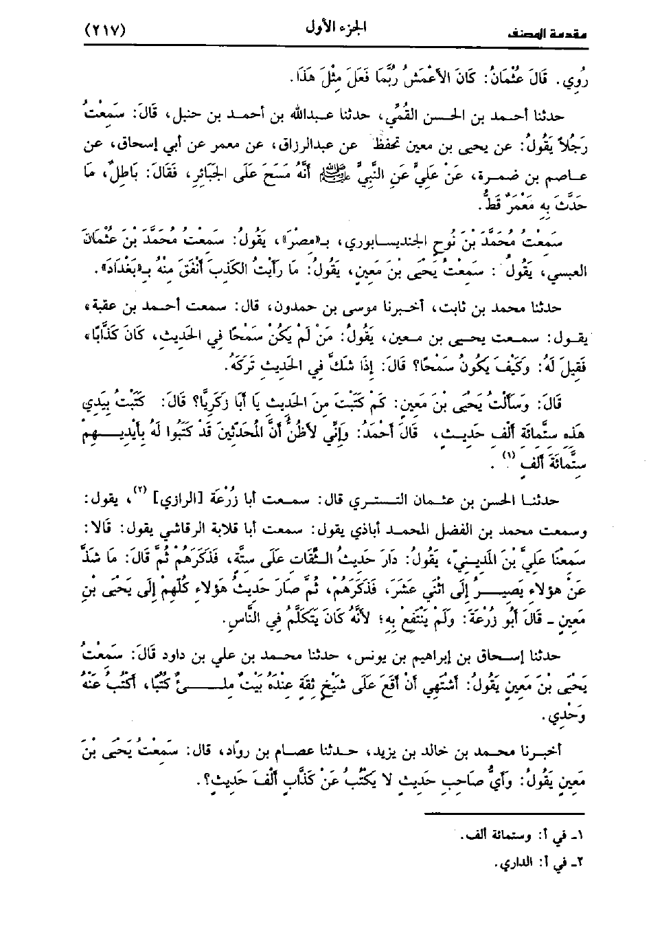 حَدَّثَنَا مُحَمد بْنُ خَالِدِ بْنِ يَزِيدَ، حَدَّثَنا عِصَامُ بْنُ رُوَّادٍ، قَالَ: سَمِعْتُ يَحْيى بْنَ مَعِين يَقُولُ: وَأَيُّ صَاحِبِ حَدِيثٍ لا يَكْتُبُ عَنْ كَذَّابٍ أَلْفَ حَدِيثٍ؟.