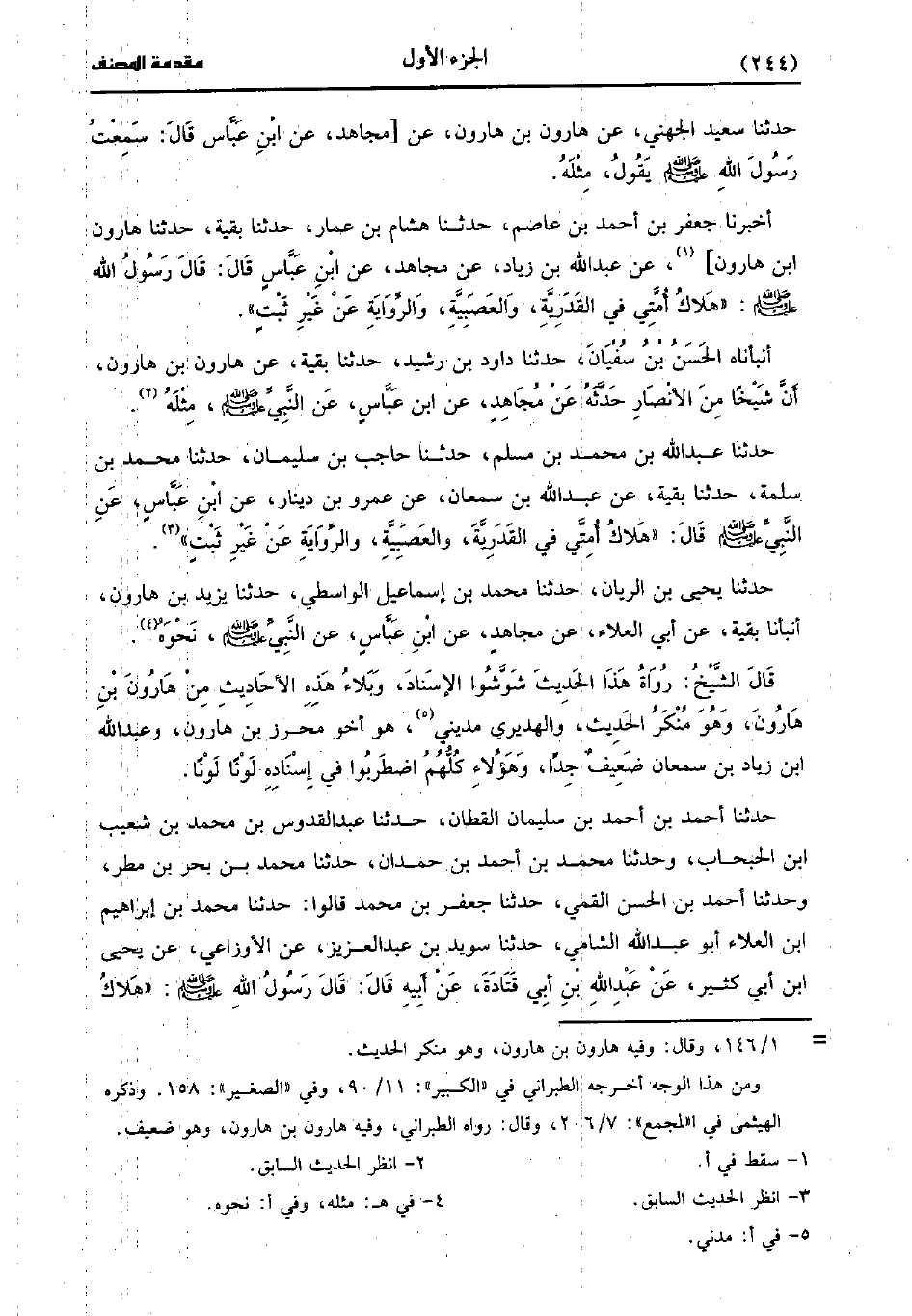 حَدَّثَنَا جَعْفَرُ بْنُ أَحْمَدَ بْنِ عَاصِمٍ، حَدَّثَنا هِشَامُ بْنُ عَمَّارٍ، حَدَّثَنا بَقِيَّةُ، حَدَّثَنا هَارُونُ بْنُ هَارُونَ عَنْ عَبد اللَّهِ بْنِ زِيَادٍ، عَنْ مُجَاهِدٍ عَنِ ابْنِ عَبَّاسٍ، قَال: قَال رَسُولُ اللَّهِ صَلَّى اللَّهُ عَلَيْهِ وَسَلَّمَ: هَلاكُ أمتي في القدرية والعصبية وَالرِّوَايَةِ عَنْ غَيْرِ ثَبْتٍ.