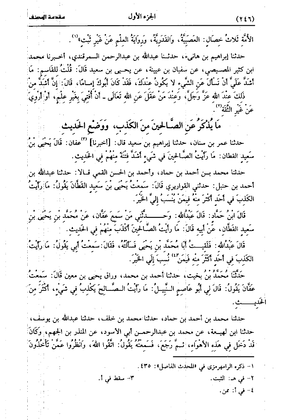 حَدَّثَنَا مُحَمد بْنُ أَحْمَدَ بْنِ حَمَّادٍ، وَأَحْمَدُ بْنُ الْحَسَنِ الْقُمِّيُّ، قَالا: حَدَّثَنا عَبد اللَّهِ بْنُ أَحْمَدَ بْنِ حَنْبَلٍ، حَدَّثني الْقَوَارِيرِيُّ، قَالَ: سَمِعْتُ يَحْيى بْنَ سَعِيد الْقَطَّانُ يَقُولُ: مَا رَأَيْتُ الْكَذِبَ فِي أَحَدٍ أَكْثَرَ مِنْهُ فِيمَنْ يَنْسِبُ إِلَيَّ الْخَيْرَ.