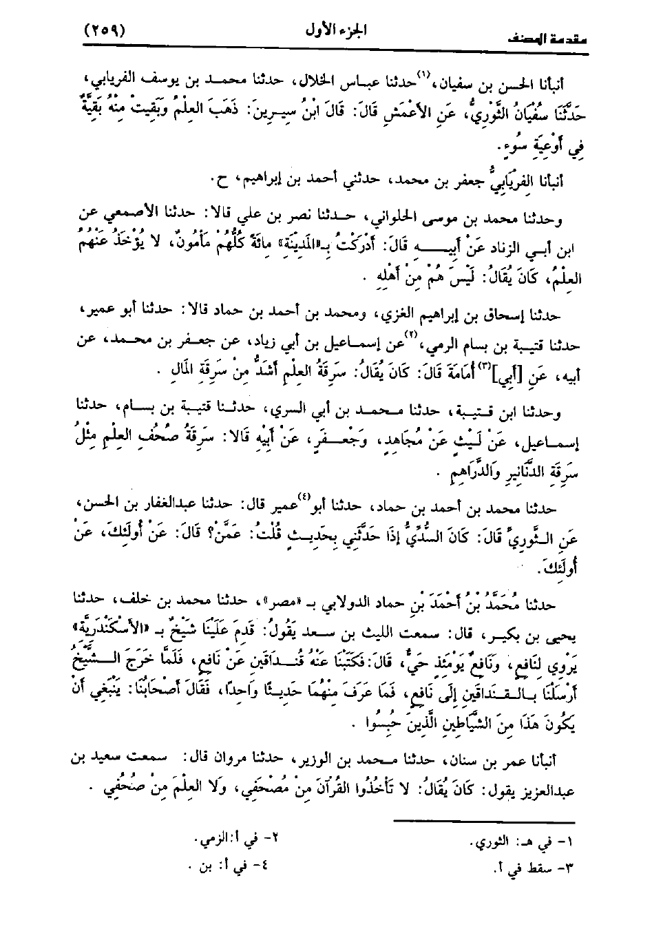 أَخْبَرنا عُمَر بْنُ سِنَانٍ، حَدَّثَنا مُحَمد بْنُ الْوَزِيرِ، حَدَّثَنا مَرَوَانُ، قَالَ: سَمِعْتُ سَعِيد بْنَ عَبد الْعَزِيزِ يَقُولُ: كَانَ يُقَالُ: لا تَأْخُذُوا الْقُرْآنَ مِنْ مُصْحَفِي، ولاَ العلم من صحفي.
