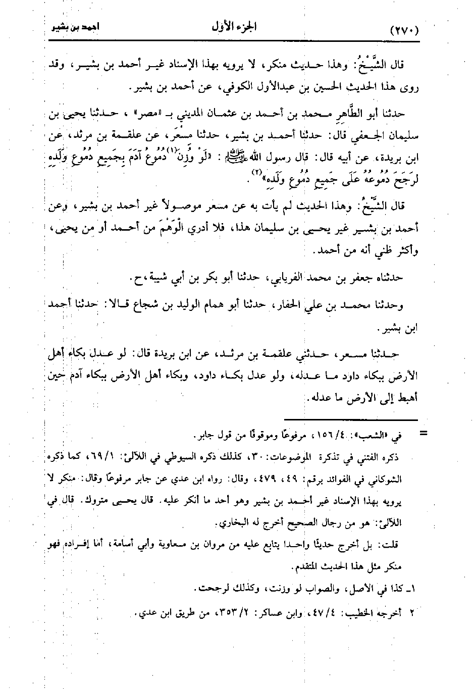 قَالَ الشَّيْخُ: وَهَذَا حَدِيثٌ مُنْكَرٌ، لا يَرْوِيهِ بَهَذَا الإِسْنَادِ غَيْرُ أَحْمَدَ بْنِ بَشِيرٍ، وَقَدْ رَوَى هَذَا الْحَدِيثَ الْحُسَيْنُ بْنُ عَبد الأَوَّلِ الْكُوفِيُّ عَنْ أَحْمَدَ بْنِ بَشِيرٍ.
