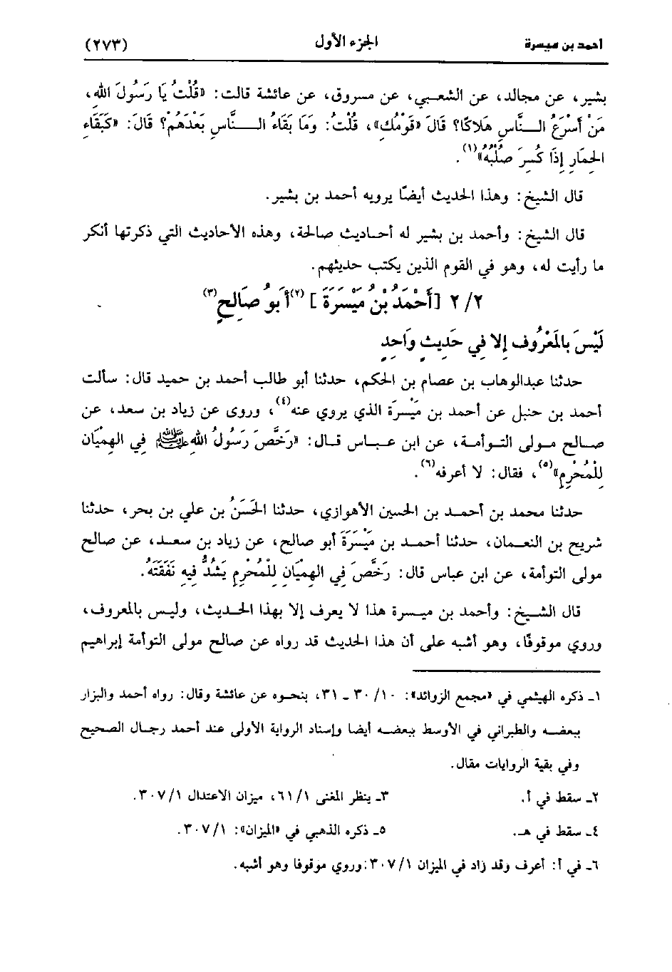 حَدَّثَنَا عَبد الْوَهَّابِ بْنُ عِصَامِ بْنِ الْحَكَمِ، حَدَّثَنا أَبُو طَالِبٍ أَحْمَدُ بْنُ حُمَيْدٍ، قالَ: سَألتُ أَحْمَدَ بْنِ حَنْبَلٍ عَنْ أَحْمَدَ بْنِ مَيْسَرَةَ الذي يروي عنه سُرَيْج (1) ، وَرَوَى عَنْ زِيَادِ بْنِ سَعْدٍ، عَنْ صَالِحٍ مَوْلَى التَّوْأَمَةُ، عنِ ابْنِ عَبَّاسٍ قَالَ: رَخَصَّ رَسُولُ اللَّهِ صَلَّى اللَّهُ عَلَيْهِ وَسَلَّمَ فِي الْهَمَيَانِ لِلْمُحْرِمِ؟ فَقَالَ: لاَ أَعْرِفُهُ.