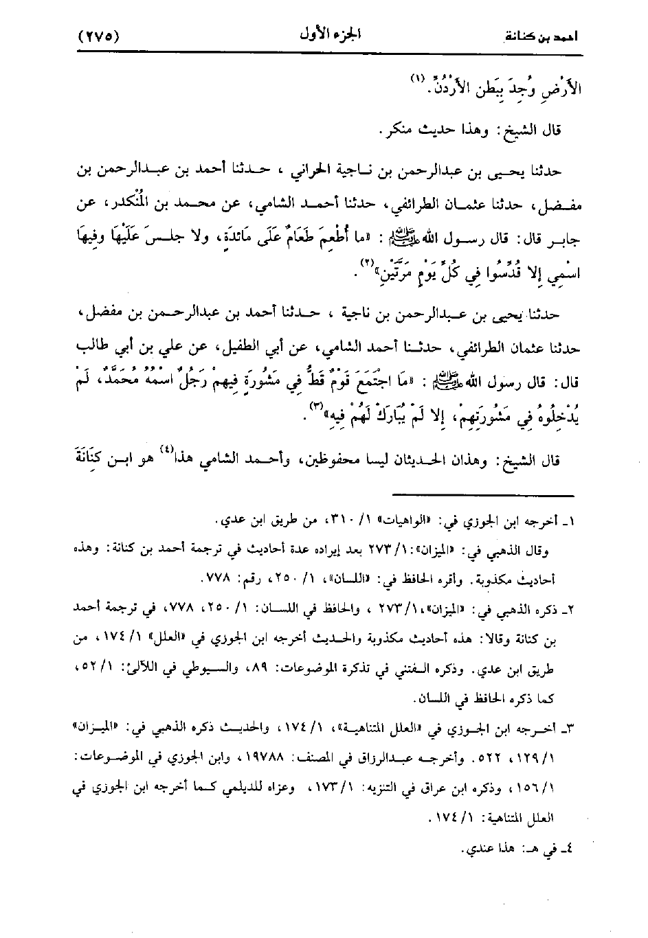 قَالَ الشَّيْخُ: وَهَذَانِ الْحَدِيثَانِ لَيْسَا مَحْفُوظَيْنِ، وَأَحْمَدُ الشَّامِيُّ هَذَا هُوَ ابْنُ كِنَانَةَ، الَّذِي يَرْوِي عَنْهُ الْوَلِيدُ بْنُ سَلَمَةَ، وَسَمِعْتُ أَبَا عَرُوبة يَقُولُ: كان عُثْمَانُ الطَّرَائِفِيُّ يَرْوِي عَنْ مَجْهُولِينَ وَعِنْدَهُ عَجَائِبُ، وَهو فِي الْجَزْرِيِّينَ كَبَقِيَةَ فِي الشَّامِيِّينَ، لأَنَّ بَقِيَةَ أَيضًا يَرْوِي عَنْ مَجْهُولِينَ وَعِنْدَهُ عجائب.