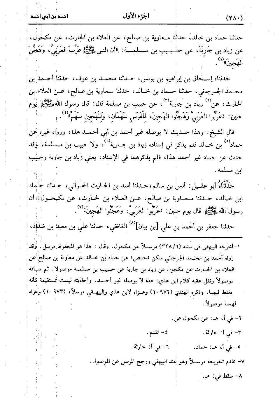 حَدَّثَنَاهُ إِسْحَاقُ بْنُ إِبْرَاهِيمَ بْنِ يُونُس، حَدَّثَنا مُحَمد بْنُ عَوْفٍ، حَدَّثَنا أَحْمَدُ بْنُ مُحَمد الْجُرْجَانِيُّ، حَدَّثَنا حَمَّادُ بْنُ خَالِدٍ، حَدَّثَنا مُعَاوِيَةُ بْنُ صَالِحٍ، عَن العَلاَء بْنِ الْحَارِثِ، عَنْ زِيَادِ بْنِ جَارِيَةَ، عَنْ حَبِيبِ بْنِ مَسْلَمَةَ، قَال: قَال رَسُولُ اللَّهِ صَلَّى اللَّهُ عَلَيْهِ وَسَلَّمَ يَوْمَ حُنَيْنٍ: عَرِّبُوا الْعَرَبِيَّ وَهَجِّنُوا الْهَجِينَ، لِلْفُرْسِ سَهْمَانِ وَلِلْهَجِينِ سَهْمٌ.