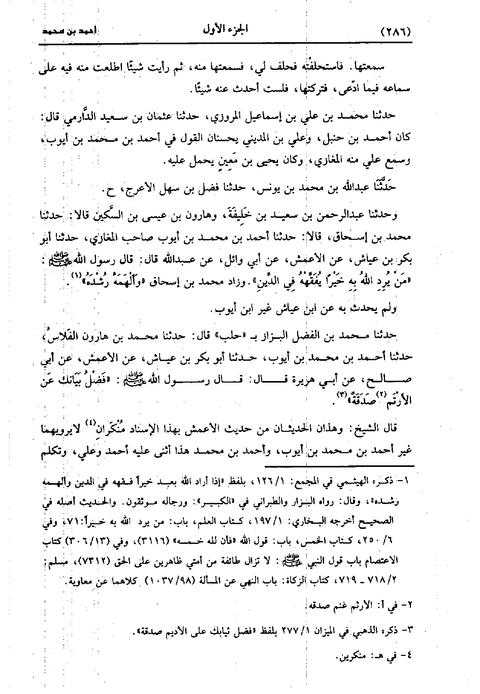 حَدَّثَنَا عَبد اللَّهِ بْنُ مُحَمد بْنِ يُونُس، حَدَّثَنا فَضْلُ بْنُ سَهْلٍ الأَعْرَجُ (ح) وَحَدَّثَنَا عَبد الرَّحْمَنِ بْنُ سَعِيد بْنِ خَلِيفَةَ، وَهَارُونُ بْنُ عِيسَى بْنِ السُّكَيْنِ، قَالا: حَدَّثَنا مُحَمد بْنُ إِسْحَاقَ، قَالا: حَدَّثَنا أَحْمَدُ بْنُ مُحَمد بْنِ أَيُّوبَ صَاحِبُ الْمَغَازِي، حَدَّثَنا أَبُو بَكْرِ بْنِ عَيَّاشٍ، عَنِ الأَعْمَش، عَن أَبِي وَائِلٍ عَنْ عَبد اللَّهِ، قَال: قَال رَسُولُ اللَّهِ صَلَّى اللَّهُ عَلَيْهِ وَسَلَّمَ: مِنَ يُرِدِ اللَّهُ بِهِ خَيْرًا يُفَقِّهُ فِي الدِّينِ، وَزَادَ مُحَمد بْنُ إِسْحَاقَ: وَأَلْهَمَهُ رُشْدَهُ.