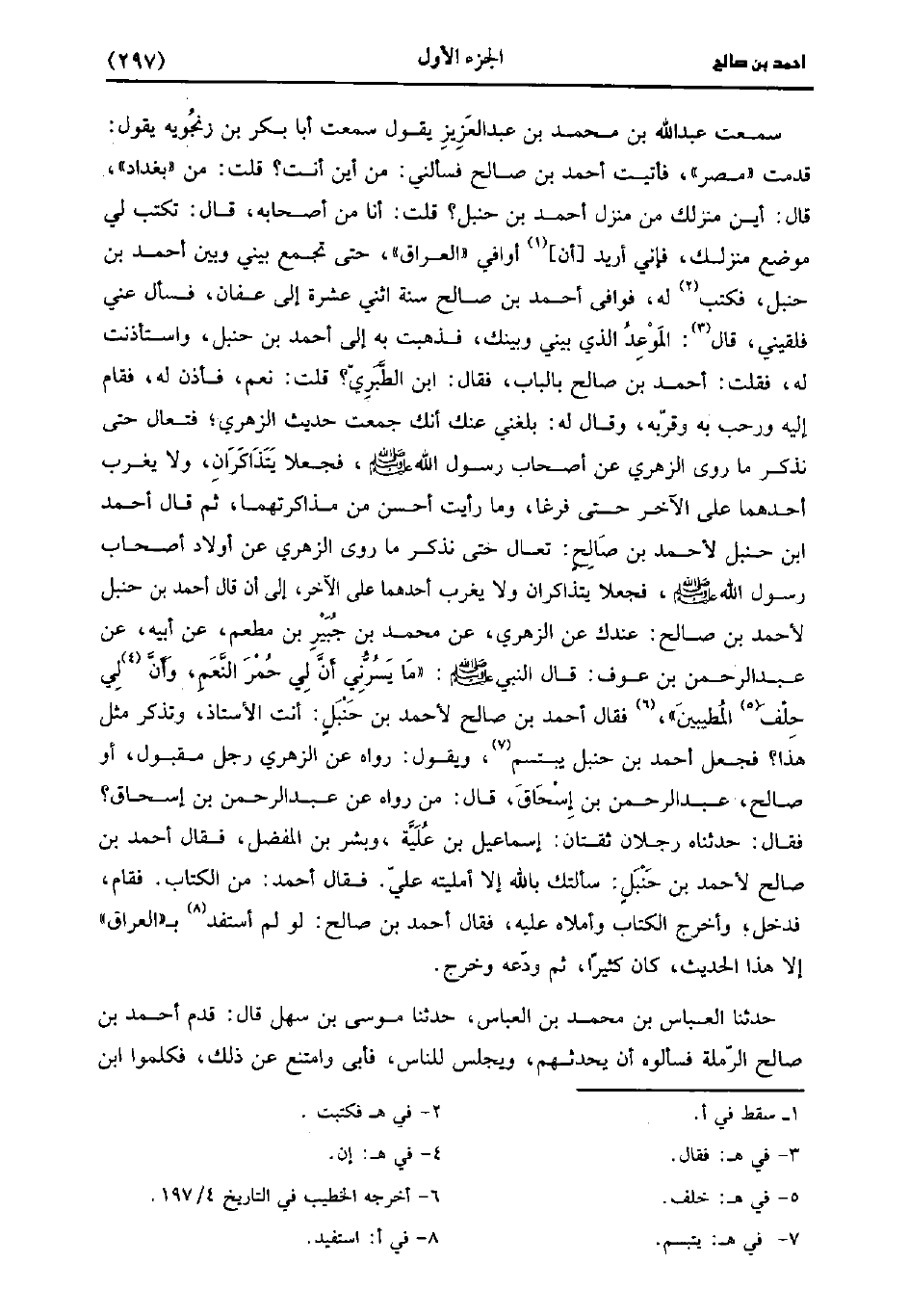 سَمِعْتُ عَبد اللَّهِ بْنَ مُحَمد بْنَ عَبد الْعَزِيزِ يَقُولُ: سَمعتُ أبا بكر بن زنجويه يقول: قدمت مصر فاتيت أحمد بن صالح فسألني: من أين أنت؟ قلت: من بغداد، قال: أين منزلك من منزل أحمد بن حنبل؟ قلت: أنا من أصحابه قال: تكتب لي موضع منزلك فإني أريد أن أوافي العراق حتى تجمع بيني وبين أحمد بن حنبل، فكتب له، فوافى أحمد بن صالح سنة اثنى عشرة إلى عفان، فسأل عني فلقيني قال: الموعد الذي بيني وبينك، فذهبت به إلى أحمد بن حنبل واستأذنت له فقلت: أحمد بن صالح بالباب فقال: ابن الطبري؟ قلتُ: نَعَم، فأذن له، فقام إليه ورحب به وقربه وقال له: بلغني عنك أنك جمعت حديث الزُّهْريّ، فتعال حتى نذكر ما روى الزُّهْريّ عن أصحاب رَسُول اللَّه صَلَّى اللَّه عَلَيْهِ وَسَلَّمَ، فجعلا يتذاكران، ولاَ يغرب أحدهما على الآخر حتى فرغا، وما رأيت أحسن من مذاكرتهما، ثم قال أحمد بن حنبل لأحمد بن صالح: تعال حتى نذكر ما روى الزُّهْريّ عن أولاد أصحاب رَسُول اللَّه صَلَّى اللَّه عَلَيْهِ وَسَلَّمَ، فجعلا يتذكران، ولاَ يغرب أحدهما على الآخر إلى أن قال أحمد بن حنبل لأحمد بن صالح: عِنْدَكَ عنِ الزُّهْريّ، عَنْ مُحَمد بْنِ جُبَيْرِ بْنِ مُطْعِمٍ، عَنْ أَبِيهِ، عَنْ عَبد الرَّحْمَنِ بْنِ عَوْفٍ، قَالَ النَّبِيُّ صَلَّى اللَّهُ عَلَيْهِ وَسَلَّمَ: مَا يَسُرُّنِي أَنَّ لِي حُمْرَ النَّعَمِ، وَأَنَّ لِي حِلْفَ الْمُطَيَّبِينَ؟ فَقَالَ أَحْمَدُ بْنُ صَالِحٍ لأَحْمَدَ بْنِ حَنْبَلٍ: أَنْتَ الأُسْتَاذُ، وَتَذْكُرُ مِثْلَ هَذَا؟ فَجَعَلَ أَحْمَدُ بْنُ حَنْبَلٍ يَبْتَسِمُ وَيَقُولُ: رَوَاهُ عنِ الزُّهْريّ رَجُلٌ مَقْبُولٌ، أَوْ صَالِحٌ: عَبد الرَّحْمَنِ بْنُ إِسْحَاقَ، قَالَ: مَنْ رَوَاهُ عَنْ عَبد الرَّحْمَنِ بْنِ إِسْحَاقَ؟ فَقَالَ: حدثناه رجلان ثقتان: إسماعيل بن عُلَيَّةَ وَبِشْرُ بْنُ الْمُفَضَّلِ، فَقَالَ أَحْمَدُ بْنُ صَالِحٍ لأَحْمَدَ بْنِ حَنْبَلٍ: سَأَلْتُكَ بِاللَّهِ إِلا أَمْلَيْتَهُ عَلَيَّ، فَقَالَ أَحْمَدُ: مِنَ الْكِتَابِ، فَقَامَ فَدَخَلَ وَأَخْرَجَ الْكِتَابَ وَأَمْلاهُ عَلَيْهِ، فَقَالَ أَحْمَدُ بْنُ صَالِحٍ: لَوْ لَمْ أَسْتَفِدْ بِالْعِرَاقِ إِلا هَذَا الْحَدِيثَ كَانَ كَثِيرًا، ثُمَّ وَدَّعَهُ وَخَرَجَ.