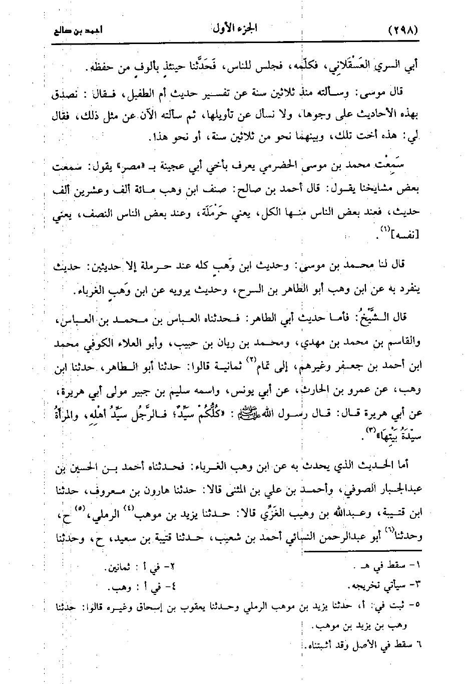 قال الشيخ: فأما حديث أبي الطاهر، فَحَدَّثَنَاهُ الْعَبَّاسُ بْنُ مُحَمد بْنِ الْعَبَّاسِ، وَالْقَاسِمُ بْنُ مُحَمد بْنِ مَهْدِيٍّ، وَمُحمد بْنُ رَيَّانَ بْنِ حَبِيبٍ، وأَبُو الْعَلاءِ الْكُوفِيُّ مُحَمد بْنُ أَحْمَدَ بْنِ جَعْفَرٍ وَغَيْرُهُمْ إِلَى تَمَامِ ثَمَانِيَةٍ، قَالُوا: حَدَّثَنا أَبُو الطَّاهِرِ، حَدَّثَنا ابْنُ وَهب، عَنْ عَمْرو بْنِ الْحَارِثِ، عَن أَبِي يُونُس، وَاسْمُهُ سُلَيْمُ بْنُ جُبَيْرٌ مَوْلَى أَبِي هُرَيْرَةَ، عَن أَبِي هُرَيْرَةَ، قَال: قَال رَسُولُ اللَّهِ صَلَّى اللَّهُ عَلَيْهِ وَسَلَّمَ: كُلُّكُمْ سَيِّدٌ، فَالرَّجُلُ سَيِّدُ أَهْلِهِ، وَالْمَرْأَةُ سَيِّدَةُ بَيْتِهَا.