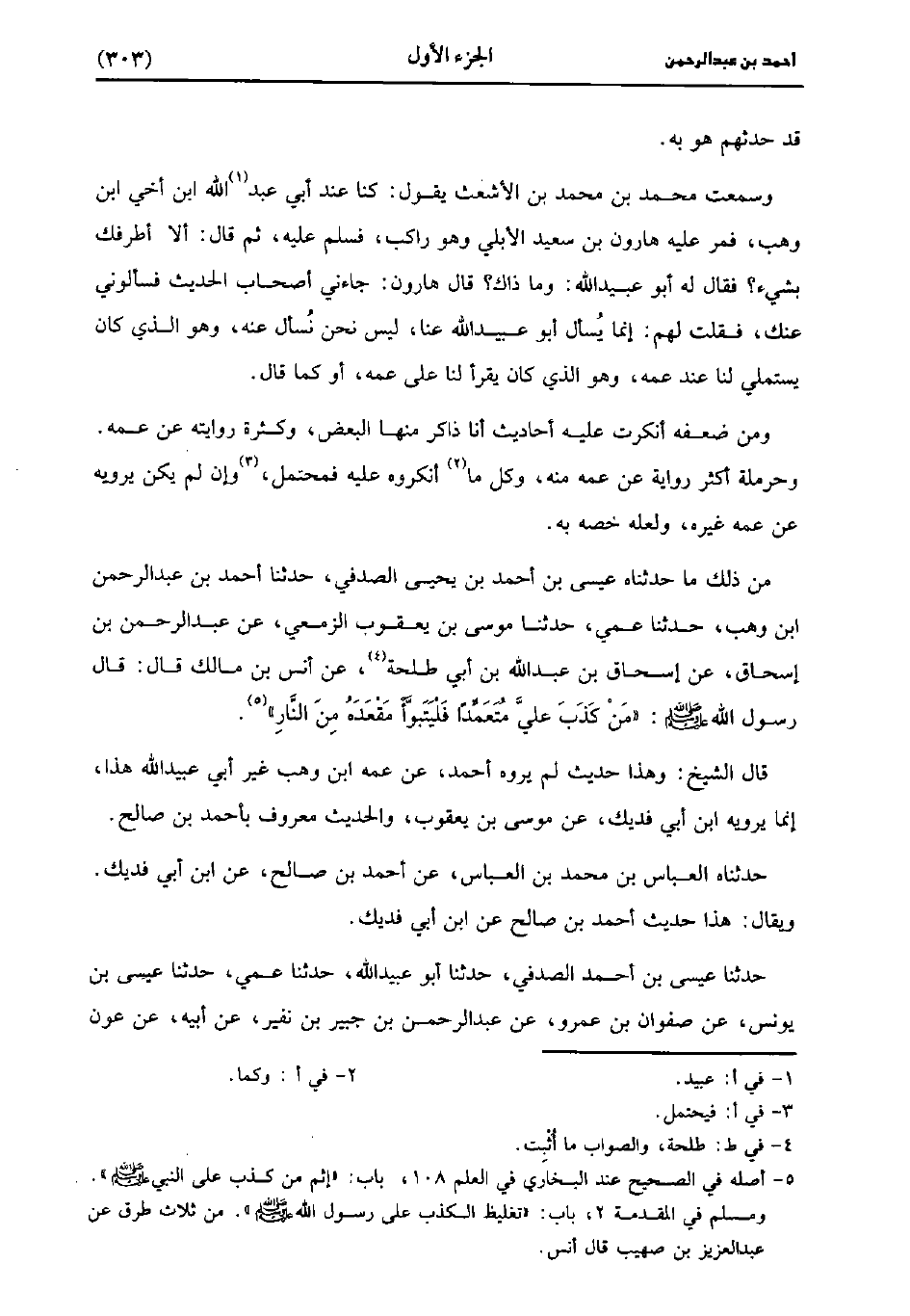 مِنْ ذَلِكَ مَا حَدَّثْنَاهُ عِيسَى بْنُ أَحْمَدَ بْنِ يَحْيى الصَّدَفِيُّ، حَدَّثَنا أَحْمَدُ بْنُ عَبد الرَّحْمَنِ بْنِ وَهْبٍ، حَدَّثَنا عَمِّي، حَدَّثَنا مُوسَى بْنُ يَعْقُوبَ الزَّمْعِيُّ عَنْ عَبد الرَّحْمَنِ بْنِ إِسْحَاقَ، عَنْ إِسْحَاقَ بْنِ عَبد اللَّهِ بْنِ أَبِي طَلْحَةَ، عَن أَنَس بْنِ مَالِكٍ، قَال: قَال رَسُولِ اللَّهِ صَلَّى اللَّهُ عَلَيْهِ وَسَلَّمَ: مَنْ كَذَبَ عَلَيَّ مُتَعَمِّدًا فَلْيَتَبَوَّأْ مَقْعَدَهُ مِنَ النَّارِ.