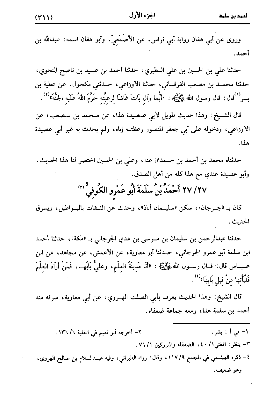 حَدَّثَنَا عَبد الرَّحْمَنِ بْنُ سُلَيْمَانَ بْنِ مُوسَى بْنِ عَدٍّي الْجُرْجَانِيُّ بِمَكَّةَ، حَدَّثَنا أحمد بن سلمة أبو عَمْرو الْجُرْجَانِيُّ، حَدَّثَنا أَبُو مُعَاوِيَةَ، عَنِ الأَعْمَش، عَنْ مُجَاهِدٍ، عنِ ابْنِ عَبَّاسٍ، قَال: قَال رَسُولُ اللَّهِ صَلَّى اللَّهُ عَلَيْهِ وَسَلَّمَ: أَنَا مَدِينَةُ الْعِلْمِ وَعَلَى بَابِهَا، فَمَنْ أَرَادَ الْعِلْمَ فَلْيَأْتِهَا مِنْ قِبَلِ بَابِهَا.