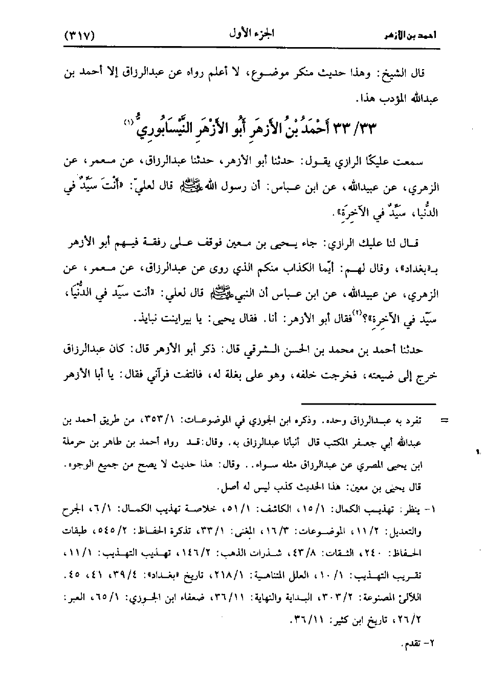 سمعت عليكا الرَّازِيَّ يَقُولُ: حَدَّثَنَا أَبو الأَزْهَر , حَدَّثَنَا عَبْد الرَّزَّاق , عن مَعْمَر , عَنِ الزُّهْرِي , عَنْ عَبْد اللهِ بْنِ عَبَّاس , أَنَّ رَسُولَ اللهِ صَلَّى اللَّهُ عَلَيْهِ وَسَلَّمَ , قَالَ لِعَلِيٍّ: "أَنْتَ سَيِّدٌ فِي الدُّنْيَا، سَيِّدٌ فِي الآخِرَةِ" قَالَ لَنَا عَلِيَّك الرَّازِي: جَاءَ يَحْيَى بْنُ مَعِين فَوَقَفَ عَلَى رُفْقَةٍ فِيهِمْ أَبو الأَزْهَر , ببَغْدَاد , وَقَالَ لَهُمْ: أَيَّمَا الكَذَّاب مِنْكُمُ , الَّذِي رَوَى عَنْ عَبْد الرَّزَّاق , عَنْ مَعْمَر , عَنِ الزُّهْرِي , عَنْ عَبْد اللهِ بْنِ عَبَّاس , أَنَّ النَّبِيَّ صَلَّى اللَّهُ عَلَيْهِ وَسَلَّمَ , قَالَ لِعَلِيٍّ: "أَنْتَ سَيِّدٌ فِي الدُّنْيَا، سَيِّدٌ فِي الآخِرَةِ"؟ فَقَالَ أَبو الأَزْهَر: أَنَا , فَقَالَ يَحْيَى: يَا بيراينت نبايذ.