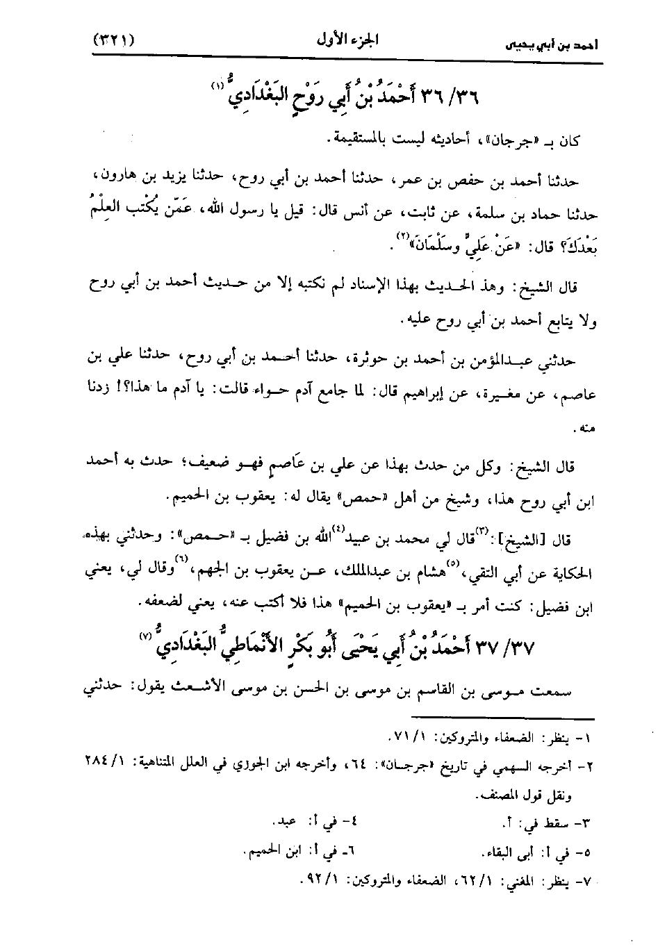 حَدَّثَنَا أَحْمَدُ بْنُ حَفْصِ بْنِ عُمَر، حَدَّثَنا أَحْمَدُ بْنُ أَبِي رَوْحٍ، حَدَّثَنا يَزِيدُ بْنُ هَارُونَ، حَدَّثَنا حَمَّادُ بْنُ سَلَمَةَ، عَنْ ثَابِتٍ، عَن أَنَس، قَال: قِيل: يَا رَسُولَ اللهِ عَمَّنْ يُكْتَبُ الْعِلْمُ بَعْدَكَ؟ قَالَ: عَنْ عَلِيٍّ وَسَلْمَانَ.