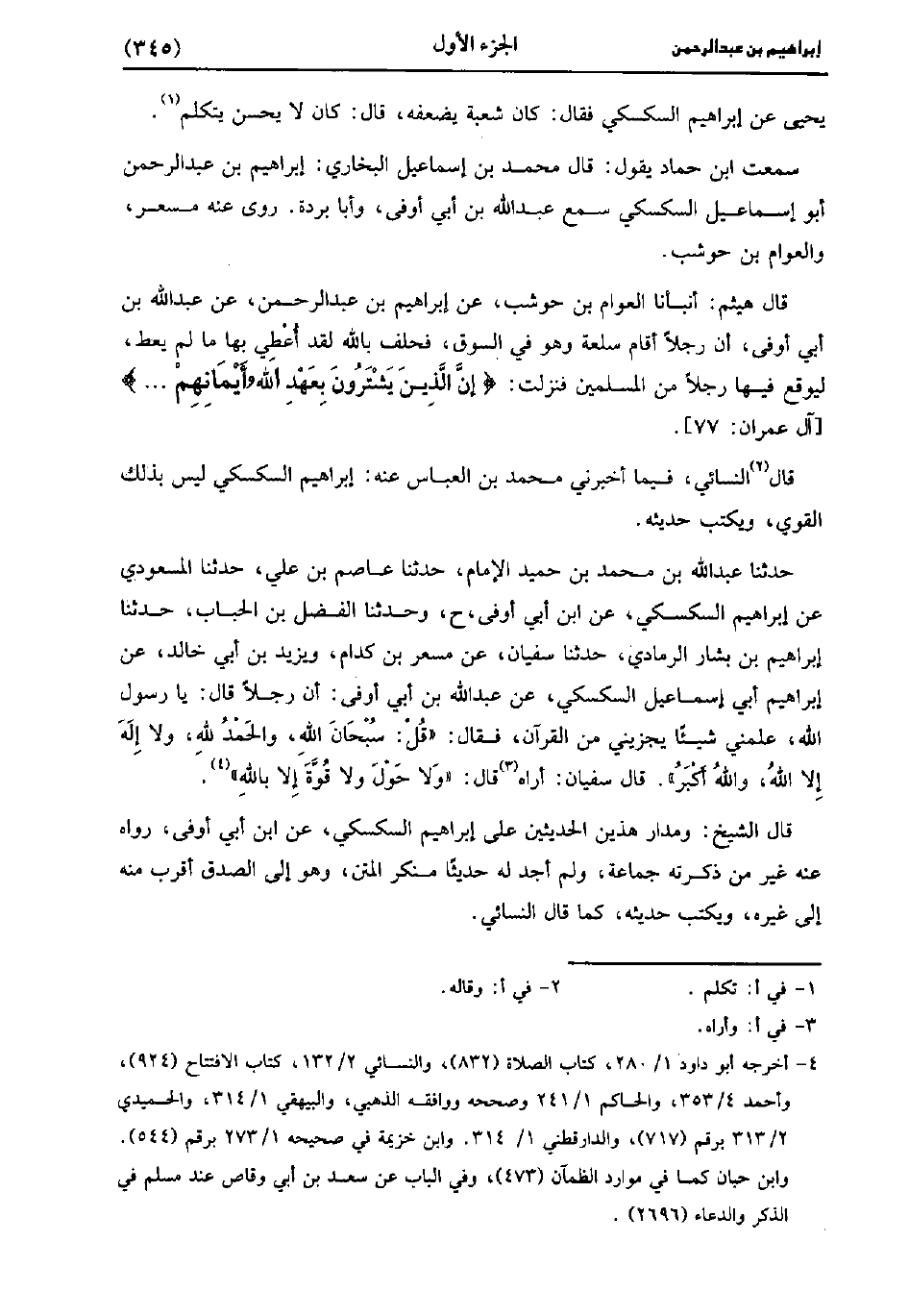 حَدَّثَنَا عَبد اللَّه بْنُ مُحَمد بْنِ حُمَيْدٍ الإِمَامِ، حَدَّثَنا عَاصِمُ بْنُ عَلِيٍّ، حَدَّثَنا الْمَسْعُودِيُّ، عَنْ إِبْرَاهِيمَ السَّكْسَكِيِّ، عنِ ابْنِ أَبِي أَوْفَى (ح) وَحَدَّثَنَا الْفَضْلُ بْنُ الْحُبَابِ، حَدَّثَنا إِبْرَاهِيمُ بْنُ بَشَّارٍ الرَّمَادِيُّ، حَدَّثَنا سُفيان، عَن مِسْعَر بْنِ كِدَامٍ، وَيَزِيدُ بْنُ أَبِي خَالِدٍ، عَنْ إِبْرَاهِيمَ أَبِي إِسْمَاعِيلَ السَّكْسَكِيِّ، عَنْ عَبد اللَّهِ بْنِ أَبِي أَوْفَى؛ أَنَّ رَجُلا قَالَ: يَا رَسُولَ اللهِ، عَلِّمْنِي شَيْئًا يُجْزِينِي مِنَ الْقُرْآنِ، فَقَالَ: قُلْ: سُبْحَانَ اللَّهِ، وَالْحَمْدُ للَّهِ، ولاَ إِلَهَ إِلا اللَّهُ، وَاللَّهُ أَكْبَرُ، قَالَ سُفْيَانُ: أَرَاهُ قَالَ: ولاَ حَوْلَ ولاَ قُوَّةَ إِلا بِاللَّهِ.