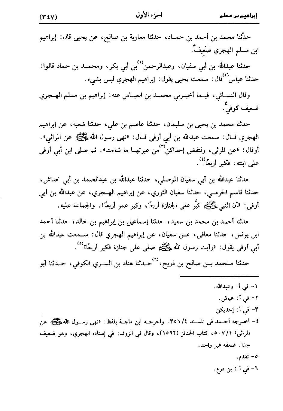 حَدَّثَنَا مُحَمد بْنُ يَحْيى بْنِ سُلَيْمَانَ، حَدَّثَنا عَاصِمُ بْنُ عَلِيٍّ، حَدَّثَنا شُعْبَة عَنْ إِبْرَاهِيمَ الْهَجَرِيِّ، قَالَ: سَمِعْتُ عَبد اللَّهِ بْنَ أَبِي أَوْفَى قَالَ: نَهَى رَسُولُ اللَّهِ صَلَّى اللَّهُ عَلَيْهِ وَسَلَّمَ عَنْ الْمَرَاثِي، أَوْ قَالَ: عَنِ الْمَرْثِيِّ، ولتقض إحداكن من عبرتها مَا شَاءَتْ، ثُمَّ صَلَّى ابْنُ أَبِي أَوْفَى عَلَى ابْنَتِهِ فَكَبَّرَ أَرْبعًا.