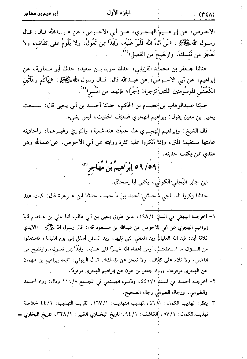 الأَحْوَصِ عَنْ إِبْرَاهِيمَ الْهَجَرِيِّ، عَن أَبِي الأَحْوصِ، عَنْ عَبد اللَّهِ، قَال: قَال رَسُولُ اللَّهِ صَلَّى اللَّهُ عَلَيْهِ وَسَلَّمَ: مَنْ أَتَاهُ اللَّهُ فَلْيَرَ عَلَيْهِ، وَابْدَأْ بِمَنْ تَعُولُ، ولاَ يُلَوَّمُ عَلَى كِفَافٍ، ولاَ تَعْجَزْ عَنْ نَفْسِكَ، وَارْتَضِحْ مِنَ الْفَضْلِ.