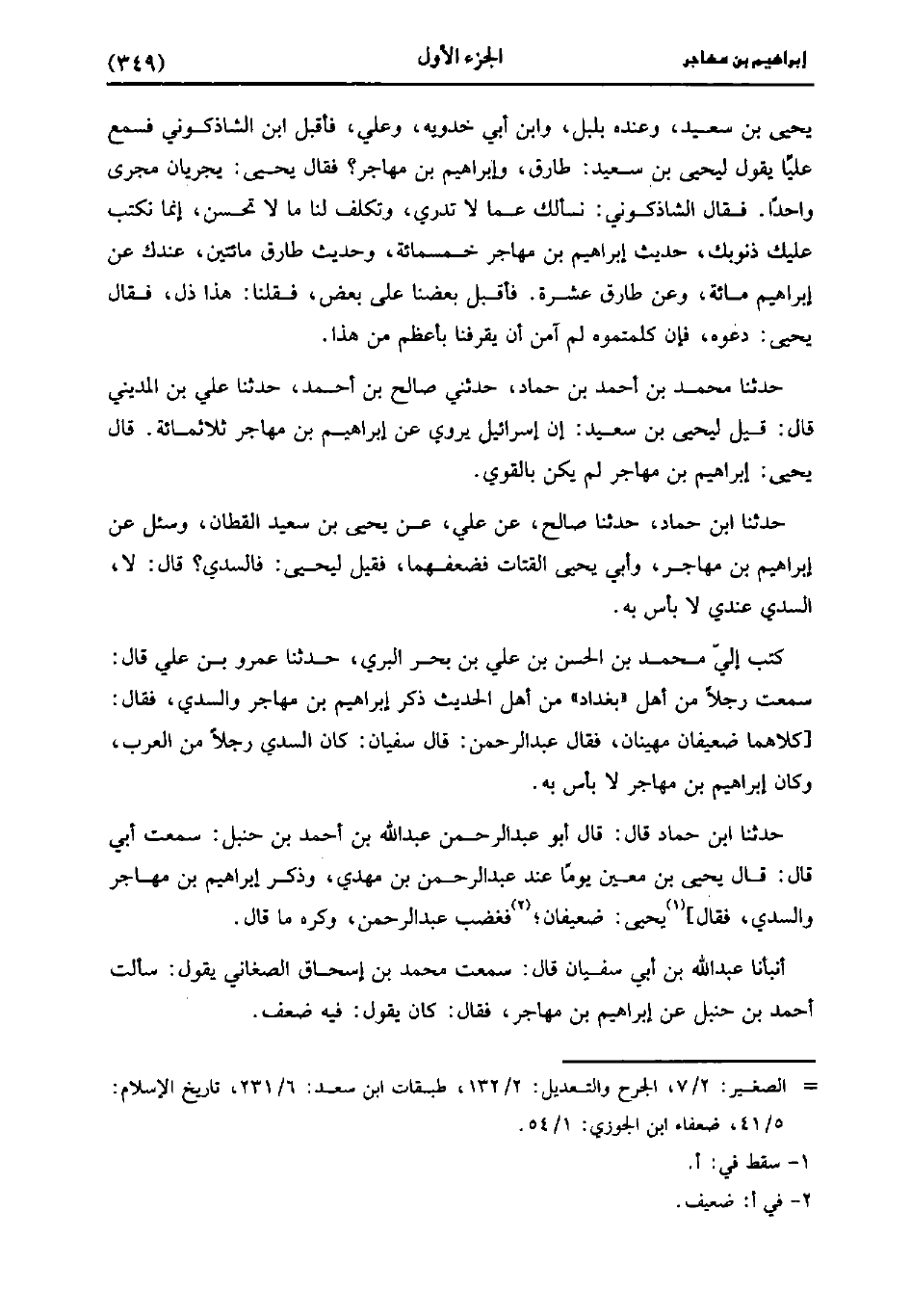 حَدَّثَنَا ابن حماد، قَال: قَال أبو عَبد الرحمن عَبد اللَّه بن أحمد بن حنبل: سمعت أبي، قَال: قَال يَحْيى بن مَعِين يوما عند عَبد الرحمن بن مهدي، وذكر إبراهيم بن مهاجر والسدي، فقال: يَحْيى ضعيفان، فغضب عَبد الرحمن وكره ما قَالَ.