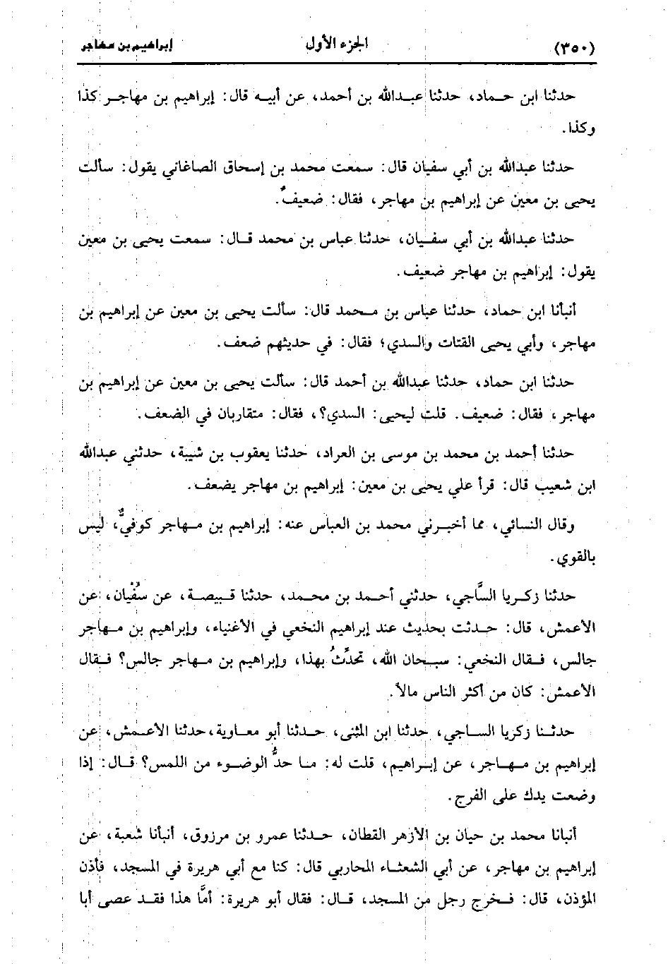 حَدَّثَنَا ابن حماد، حَدَّثَنا عَبد اللَّهِ بْنُ أَحْمَدَ، قالَ: سَألتُ يَحْيى بْنَ مَعِين عن إبراهيم بن مهاجر فقال: ضعيف، قلت ليحيى: السدي؟ فقال: متقاربان في الضعف.