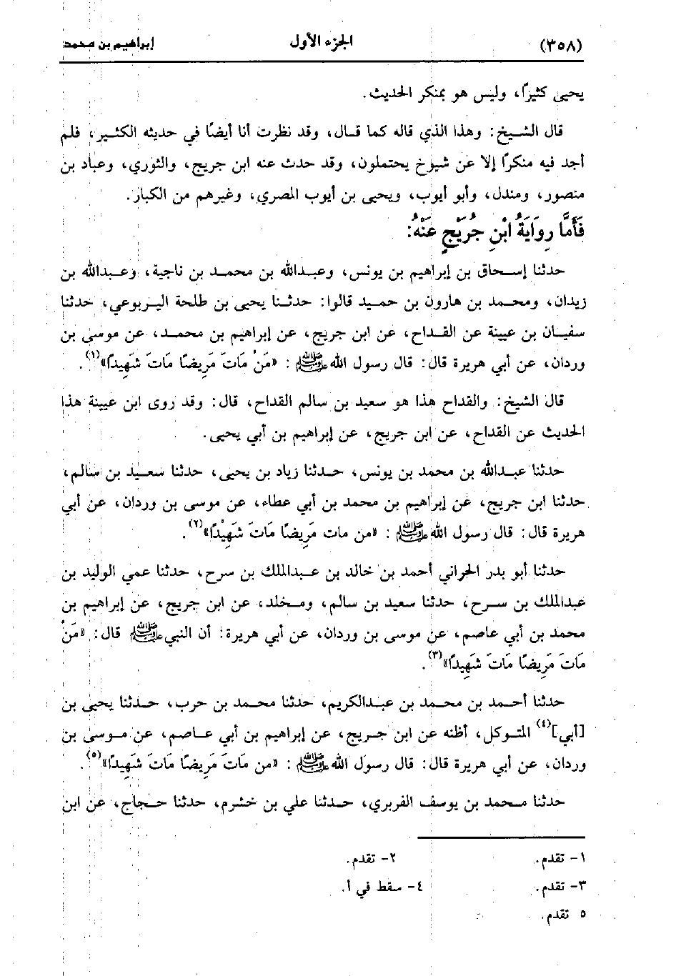 حَدَّثَنَا إِسْحَاقُ بْنُ إِبْرَاهِيمَ بْنِ يُونُس، وَعَبد اللَّهِ بْنُ مُحَمد بْنِ نَاجِيَةَ، وَعَبد اللَّهِ بن زيدان، وَمُحمد بْنُ هَارُونَ بْنِ حُمَيْدٍ، قَالُوا: حَدَّثَنا يَحْيى بْنُ طَلْحَةَ الْيَرْبُوعِيُّ، حَدَّثَنا سُفْيَانُ بْنُ عُيَينة، عَنْ الْقَدَّاحِ، عنِ ابْنِ جُرَيج، عَن إِبْرَاهِيمَ بْنِ مُحَمد، عَنْ مُوسَى بْنِ وَرْدَانَ، عَن أَبِي هُرَيْرَةَ، قَال: قَال رَسُولُ اللَّهِ صَلَّى اللَّهُ عَلَيْهِ وَسَلَّمَ: مِنَ مَاتَ مَرِيضًا مَاتَ شَهِيدًا.