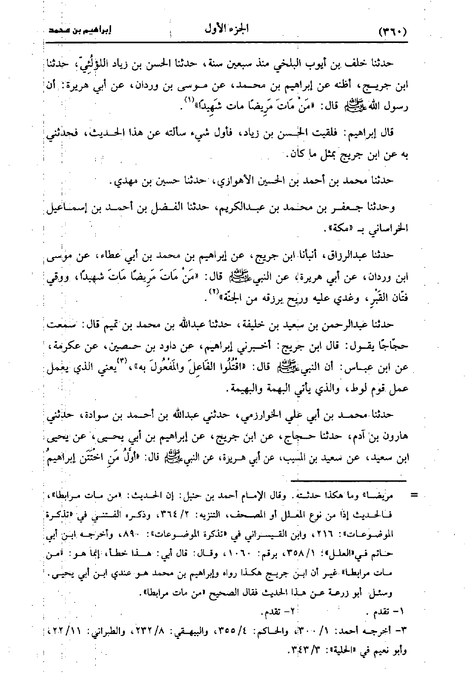 حَدَّثَنَا مُحَمد بْنُ أَحْمَدَ بْنِ الْحُسَيْنِ الأَهْوَازِيُّ، حَدَّثَنا حُسَيْنُ بْنُ مهدي (ح) وَحَدَّثَنَا جَعْفَرُ بْنُ مُحَمد بْنِ عَبد الْكَرِيمِ، حَدَّثَنا الْفَضْلُ بْنُ أَحْمَدَ بْنِ إِسْمَاعِيلَ الْخُرَاسَانِيُّ بِمَكَّةَ، حَدَّثَنَا عَبد الرَّزَّاق، أَنْبَأَنَا ابْنُ جُرَيج، عَن إِبْرَاهِيمَ بْنِ مُحَمد بن أبي عَطاء، عَن موسى بْنِ وَرْدَانَ، عَن أَبِي هُرَيْرَةَ، عَنِ النَّبِيِّ صَلَّى اللَّهُ عَلَيه وسَلَّم قَال: مَنْ مَاتَ مَرِيضًا مَاتَ شَهِيدًا، ووُقي فِتَانَ الْقَبْرِ، وَغُدِيَ عَلَيْهِ وَرِيحَ بِرِزْقِهِ مِنَ الْجَنَّةِ.