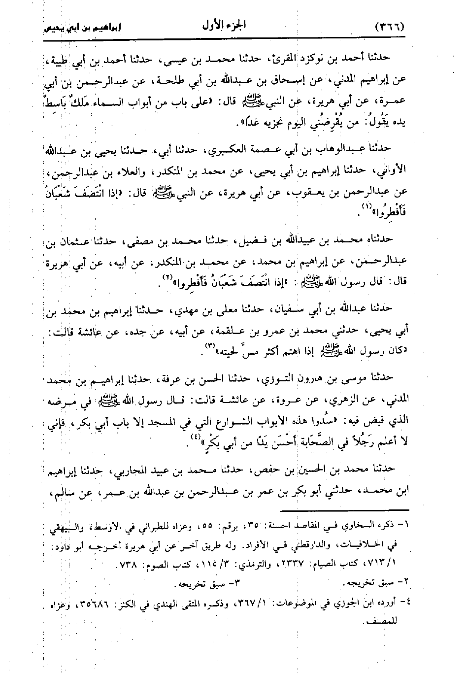حَدَّثَنَاهُ مُحَمد بْنُ عُبَيد اللَّهِ بْنِ فُضَيْلٍ، حَدَّثَنا مُحَمد بْنُ مُصَفَّى، حَدَّثَنا عُثْمَانُ بْنُ عَبد الرَّحْمَنِ، عَنْ إِبْرَاهِيمَ بْنُ مُحَمد، عَنْ مُحَمد بْنِ الْمُنْكَدِرِ، عَنْ أَبِيهِ، عَن أَبِي هُرَيْرَةَ، قَال: قَال رَسُولُ اللَّهِ صَلَّى اللَّهُ عَلَيْهِ وَسَلَّمَ: إِذَا انْتَصَفَ شَعْبَانُ فَأَفْطِرُوا.