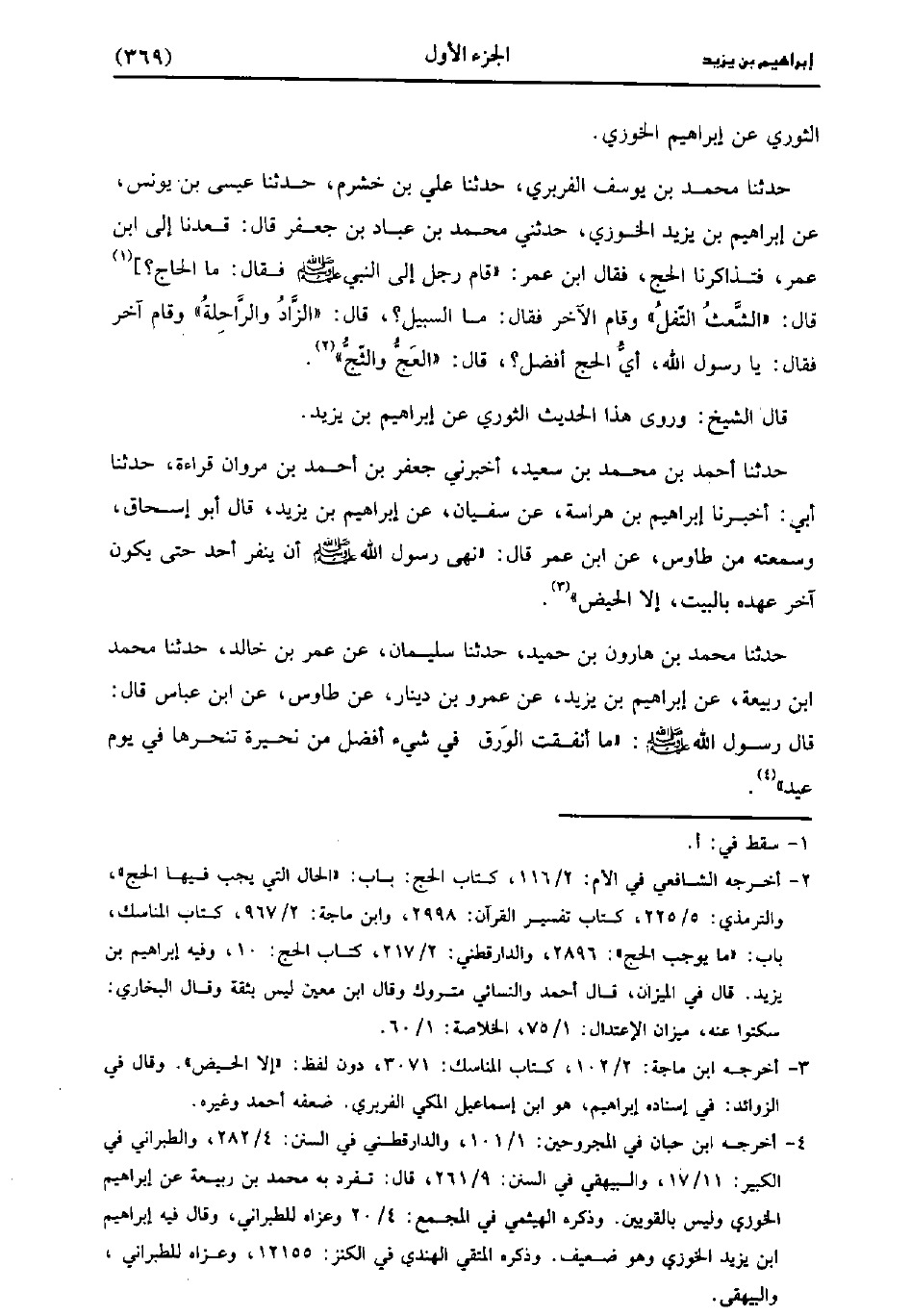 حَدَّثَنَا مُحَمد بْنُ يُوسُفَ الْفِرْبَرِيُّ، حَدَّثَنا عَلِيُّ بْنُ خَشْرَمٍ، حَدَّثَنا عِيسَى بْنُ يُونُس، عَنْ إِبْرَاهِيمَ بْنِ يَزِيدَ الْخُوزِيِّ، حَدَّثني مُحَمد بْنُ عَبَّادِ بْنِ جَعْفَرٍ، قَالَ: قَعَدْنَا إِلَى ابْنِ عُمَر فَتَذَاكَرْنَا الْحَجَّ، فَقَالَ ابْنُ عُمَر: قَامَ رَجُلٌ إِلَى النَّبِيِّ صَلَّى اللَّهُ عَلَيْهِ وَسَلَّمَ فَقَالَ: مَا الْحَاجُّ؟ قَالَ: الشُّعْثُ التُّفْلُ، وَقَامَ الآخَرُ فَقَالَ: مَا السَّبِيلُ؟ قَالَ: الزَّادُ وَالرَّاحِلَةُ، وَقَامَ آخَرُ فَقَالَ: يَا رَسُولَ اللهِ، أَيُّ الْحَجِّ أَفْضَلُ؟ قَالَ: الْعَجُّ وَالثَّجُّ.