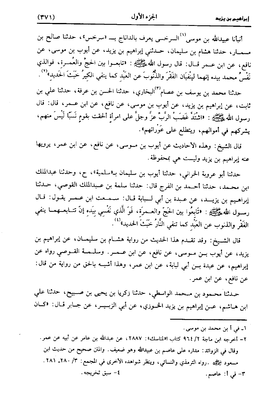 أَنْبَأَنَا عُبَيد اللَّهِ بْنُ مُوسَى السَّرَخْسِيُّ، يُعْرَفُ بِالدَّانَّاجِ بِسَرْخَسَ، حَدَّثَنا صَالِحُ بْنُ مِسْمَارٍ، حَدَّثَنا هِشَامُ بْنُ سُلَيْمَانَ، حَدَّثني إِبْرَاهِيمُ بْنُ يَزِيدَ، عَنْ أَيُّوبَ بْنِ مُوسَى، عَنْ نَافِعٍ، عنِ ابْنِ عُمَر، قَال: قَال رَسُولُ اللَّهِ صَلَّى اللَّهُ عَلَيْهِ وَسَلَّمَ: تَابِعُوا بَيْنَ الْحَجَّ وَالْعُمْرَةَ، فَوَالَّذِي نَفْسُ مُحَمد بِيَدِهِ إِنَّهُمَا لَيَنْفِيَانِ الْفَقْرَ وَالذُّنُوبَ عَنِ الْعَبْدِ، كَمَا يَنْفِي الْكِيرُ خَبَثَ الْحَدِيدِ.