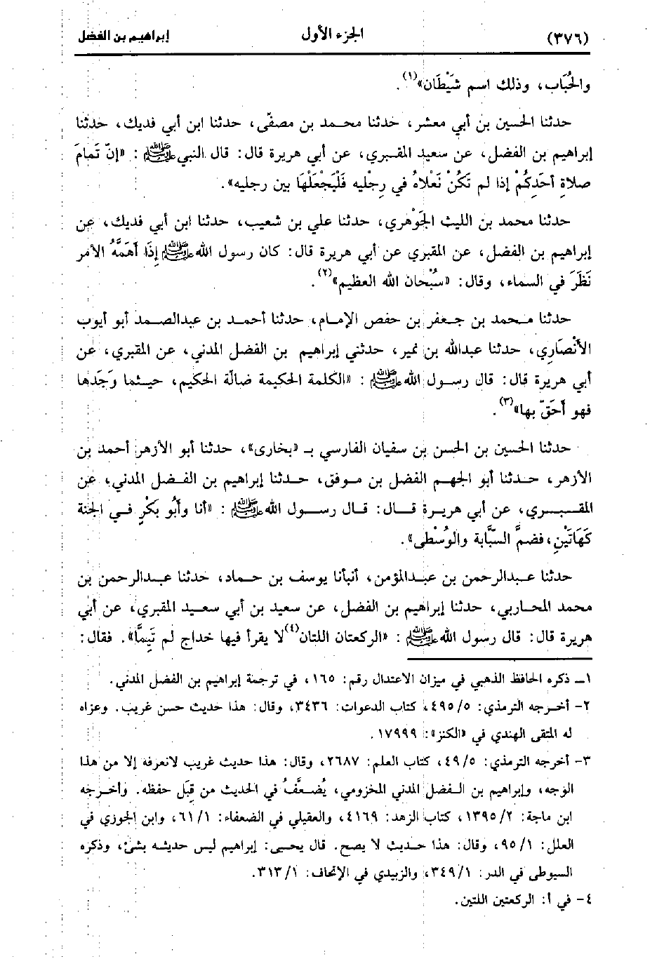 حَدَّثَنَا الْحُسَيْنُ بْنُ أَبِي مَعْشَرٍ، حَدَّثَنا مُحَمد بْنُ مُصَفَّى، حَدَّثَنا ابْنُ أَبِي فَدِيكٍ، حَدَّثَنا إِبْرَاهِيمُ بْنِ الْفَضْلِ، عَنْ سَعِيد الْمَقْبِرِيِّ، عَن أَبِي هُرَيْرَةَ، قَال: قَال النَّبِيُّ صَلَّى اللَّهُ عَلَيْهِ وَسَلَّمَ: إِنَّ تَمَامَ صَلاةِ أَحَدِكُمْ إِذَا لَمْ تَكُنْ نَعْلاهُ فِي رِجْلَيْهِ، فَلْيَجْعَلْهُمَا بَيْنَ رِجْلَيْهِ.