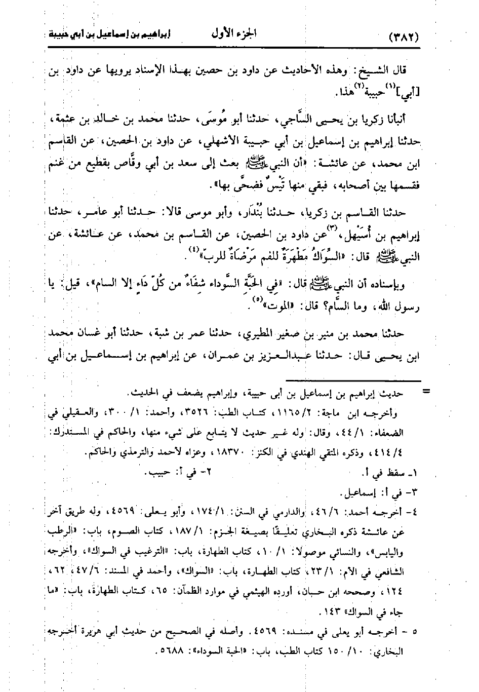 حَدَّثَنَا الْقَاسِمُ بْنُ زَكَرِيَّا، حَدَّثَنا بُنْدَار، وأَبُو مُوسَى، قَالا: حَدَّثَنا أَبُو عَامِرٍ، حَدَّثَنا إِبْرَاهِيمُ بْنُ إْسِمَاعِيلَ (1) ، عَنْ دَاوُدَ بْنِ الْحُصَيْنِ، عَنِ الْقَاسِمِ بْنِ مُحَمد، عَنْ عَائِشَةَ، عَنِ النَّبِيِّ صَلَّى اللَّهُ عَلَيه وسَلَّم قَال: السِّوَاكُ مَطْهَرَةٌ لِلْفَمِّ، مَرْضَاةٌ لِلرَّبِّ.