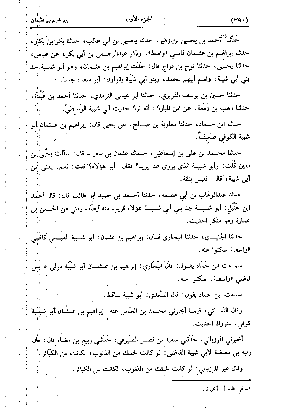 حَدَّثَنَا ابن حماد، حَدَّثَنا معاوية بن صالح، عن يَحْيى قال: إبراهيم بن عثمان أبو شيبة الكوفي ضعيف.