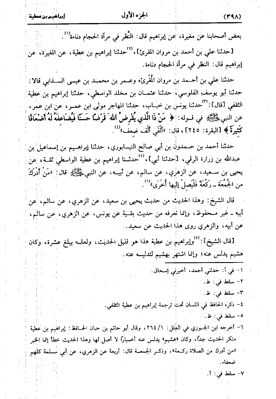 حَدَّثَنَا علي بن أحمد بن مروان المقرىء، وَعُمَرُ بْنُ مُحَمد بْنِ عِيسَى السَّذَابِيُّ، قَالا: حَدَّثَنا أَبُو يُوسُفَ الْفَلُوسِيُّ، حَدَّثَنا عُثْمَانُ بْنُ مُخَلَّدٍ الْوَاسِطِيُّ، حَدَّثَنا إِبْرَاهِيمُ بُنْ عَطِيَّةَ الثَّقَفِيُّ، قَال: حَدَّثَنا يُونُس بْنُ خَبَّابٍ، حَدَّثَنا الْمُهَاجِرُ مَوْلَى ابْنِ عُمَر، عنِ ابْنِ عُمَر، عَنِ النَّبِيُّ صَلَّى اللَّهُ عَلَيْهِ وَسَلَّمَ فِي قَوْلِهِ: {مَنْ ذَا الَّذِي يُقْرِضُ اللَّهَ قَرْضًا حَسَنًا فَيُضَاعِفَهُ له أضعافا كثيرة} ، قَالَ: أَلْفَيْ أَلْفِ ضِعْفٍ.