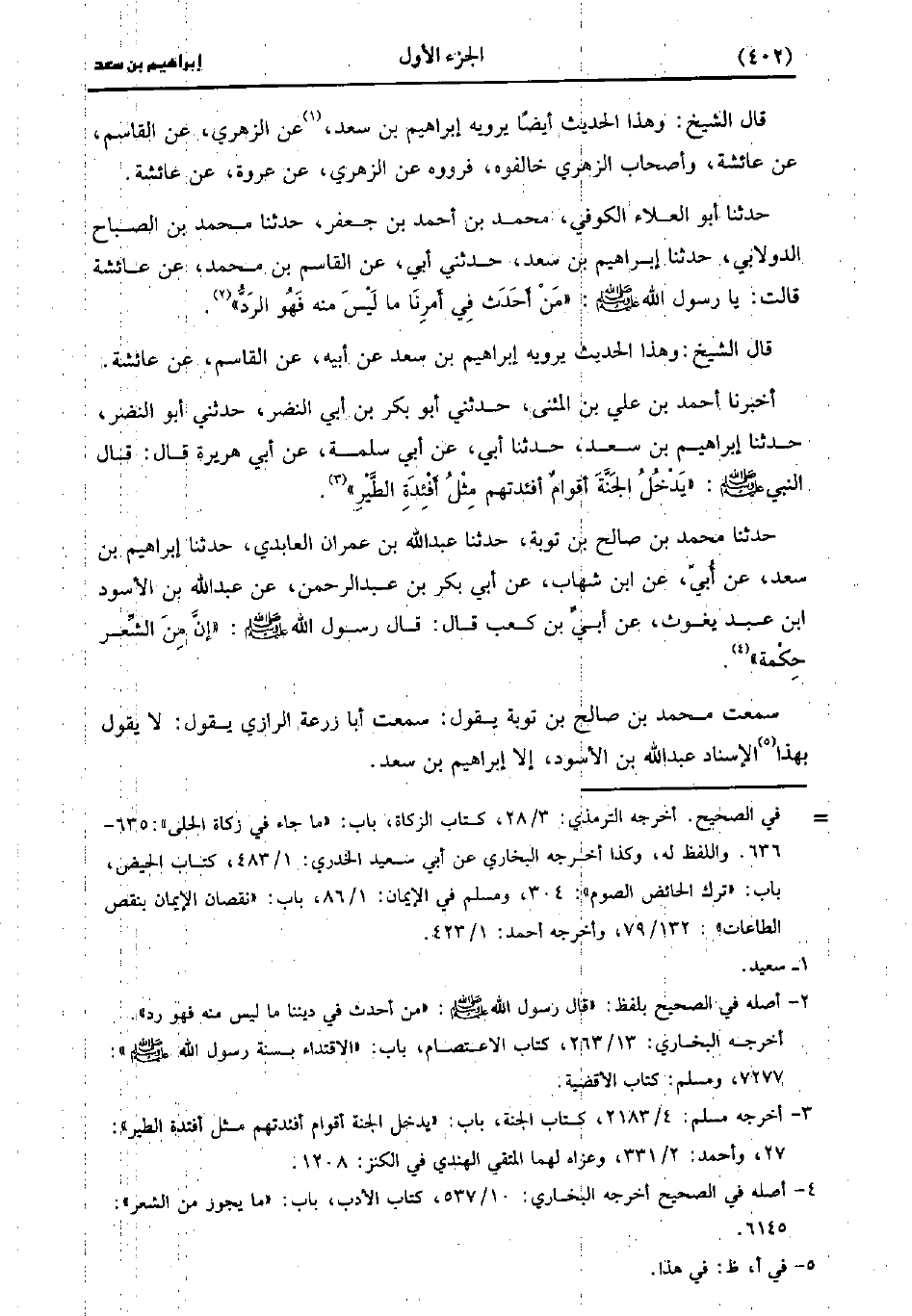 حَدَّثَنَا أَبُو الْعَلاءِ الْكُوفِيُّ مُحَمد بْنُ أَحْمَدَ بْنِ جَعْفَرٍ، حَدَّثَنا مُحَمد بْنُ الصَّبَّاحِ الدُّولابِيُّ، حَدَّثَنا إِبْرَاهِيمُ بْنُ سَعْدٍ، حَدَّثني أَبِي، عَنِ الْقَاسِمِ بْنِ مُحَمد، عَنْ عَائِشَةَ قَالَتْ: قَالَ رَسُولُ اللَّهِ صَلَّى اللَّهُ عَلَيْهِ وَسَلَّمَ: مِنَ أَحْدَثَ فِي أَمْرِنَا مَا لَيْسَ منه فهو رَدٌّ (1) .