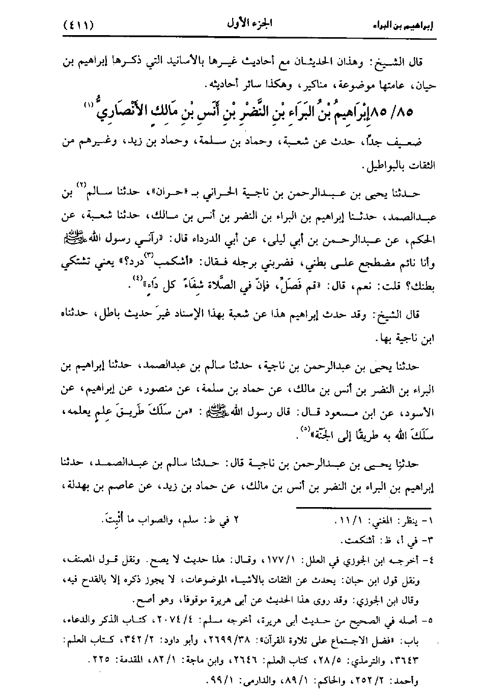 حَدَّثَنَا يَحْيى بْنُ عَبد الرَّحْمَنِ بْنِ نَاجِيَةَ، حَدَّثَنا سَالِمُ بْنُ عَبد الصَّمَدِ، حَدَّثَنا إِبْرَاهِيمُ بْنُ البراء بن النضر بن أنس بْنِ مَالِكٍ، عَنْ حَمَّادِ بْنِ سَلَمَةَ، عَنْ مَنْصُورٍ، عَنْ إِبْرَاهِيمَ، عَنِ الأَسْوَدِ، عَنِ ابْنِ مَسْعُودٍ، قَال: قَال رَسُولُ اللَّهِ صَلَّى اللَّهُ عَلَيْهِ وَسَلَّمَ: مَنْ سَلَكَ طَرِيقَ عِلْمٍ يَعْلَمُهُ، سَلَكَ اللَّهُ بِهِ طَرِيقًا إِلَى الْجَنَّةِ.