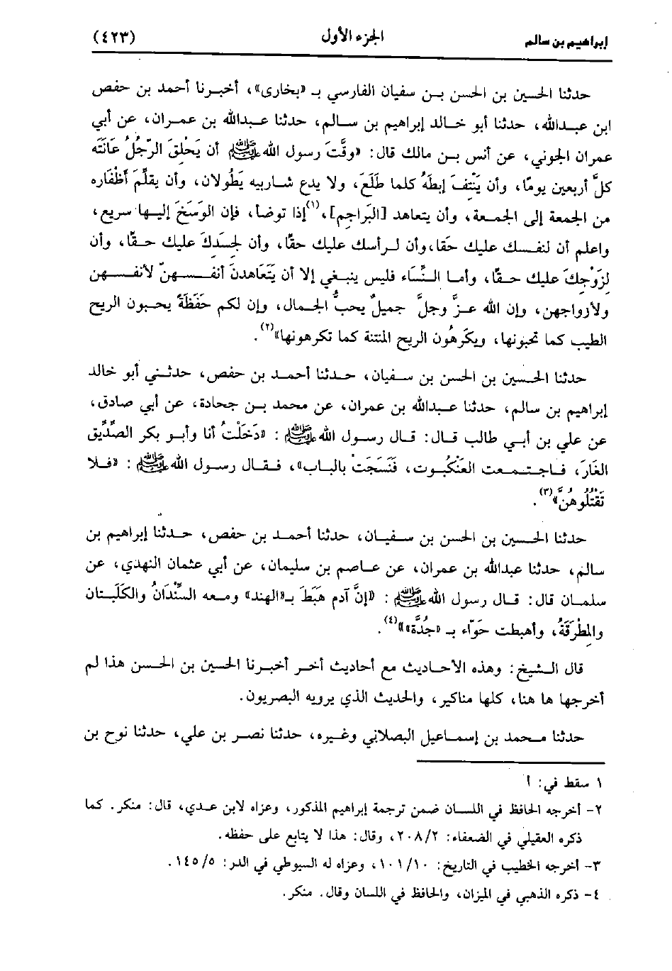 حَدَّثَنَا الحسين بن حسن بْنِ سُفْيَانَ الْفَارِسِيُّ بِبُخَارَى، أَخْبَرنا أَحْمَدُ بْنُ حَفْصِ بْنِ عَبد اللَّهِ، حَدَّثَنا أَبُو خَالِدٍ إِبْرَاهِيمُ بْنُ سَالِمٍ، حَدَّثَنا عَبد اللَّهِ بْنُ عِمْرَانَ، عَن أَبِي عِمْرَانَ الْجُونِيِّ، عَن أَنَس بْنِ مَالِكٍ قَالَ: وقَّت رَسُولُ اللَّهِ صَلَّى اللَّهُ عَلَيْهِ وَسَلَّمَ أَنْ يَحْلِقَ الرَّجُلُ عَانَتَهُ كُلَّ أَرْبَعِينَ يَوْمًا، وَأَنْ يَنْتِفَ إِبِطَهُ كُلَّمَا طَلَعَ، ولاَ يَدَعْ شَارِبَيْهِ يَطُولانِ، وَأَنْ يُقَلِّمَ أَظْفَارِهِ مِنَ الْجُمُعَةِ إِلَى الْجُمُعَةِ، وَأَنْ يَتَعَاهَدَ الْبَرَاجِمَ إِذَا تَوَضَّأَ، فَإِنَّ الْوَسَخَ إِلَيْهَا سَرِيعٌ، وَاعْلَمْ أَنَّ لِنَفْسِكَ عَلَيْكَ حَقًّا، وَأَنَّ لِرَأْسِكَ عَلَيْكَ حَقًّا، وَأَنَّ لِجَسَدِكَ عَلَيْكَ حَقًّا وَأَنَّ لِزَوْجِكَ عَلَيْكَ حَقًّا، وَأَمَّا النِّسَاءُ فَلَيْسَ يَنْبَغِي إِلا أَنْ يَتَعَاهَدْنَ أَنْفُسَهُنَّ لأنفسهن وَلأَزْوَاجِهِنَّ، وَإِنَّ اللَّهَ عَزَّ وَجَلَّ جَمِيلٌ يُحِبُّ الْجَمَالَ، وَإِنَّ لَكُمْ حَفَظَةٌ يُحِبُّونَ الرِّيحَ الطَّيِّبَ كَمَا تُحِبُّونَهَا وَيَكْرَهُونَ الرِّيحَ الْمُنْتِنَةَ كَمَا تَكْرَهُونَهَا.
