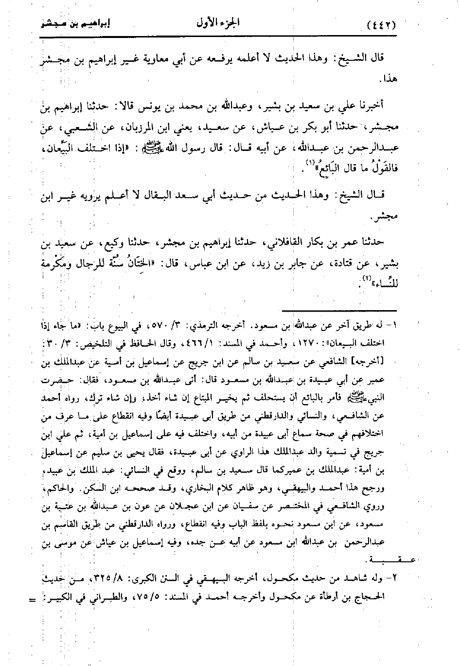 حَدَّثَنَا عَلِيُّ بْنُ سَعِيد بْنِ بَشِيرٍ، وَعَبد اللَّهِ بْنُ مُحَمد بْنِ يُونُس، قَالا: حَدَّثَنا إِبْرَاهِيمُ بْنُ مُجَشِّرٍ، حَدَّثَنا أَبُو بَكْرِ بْنِ عَيَّاشٍ، عَنْ سَعِيد، يَعني ابْنُ الْمِرْزِبَانِ، عَنِ الشَّعْبِيِّ، عَنْ عَبد الرَّحْمَنِ بْنُ عَبد اللَّهِ، عَنْ أَبِيهِ، قَال: قَال رَسُولُ اللَّهِ صَلَّى اللَّهُ عَلَيْهِ وَسَلَّمَ: إِذَا اخْتَلَفَ الْبَيِّعَانِ فَالْقَوْلُ مَا قَالَ الْبَائِعُ.