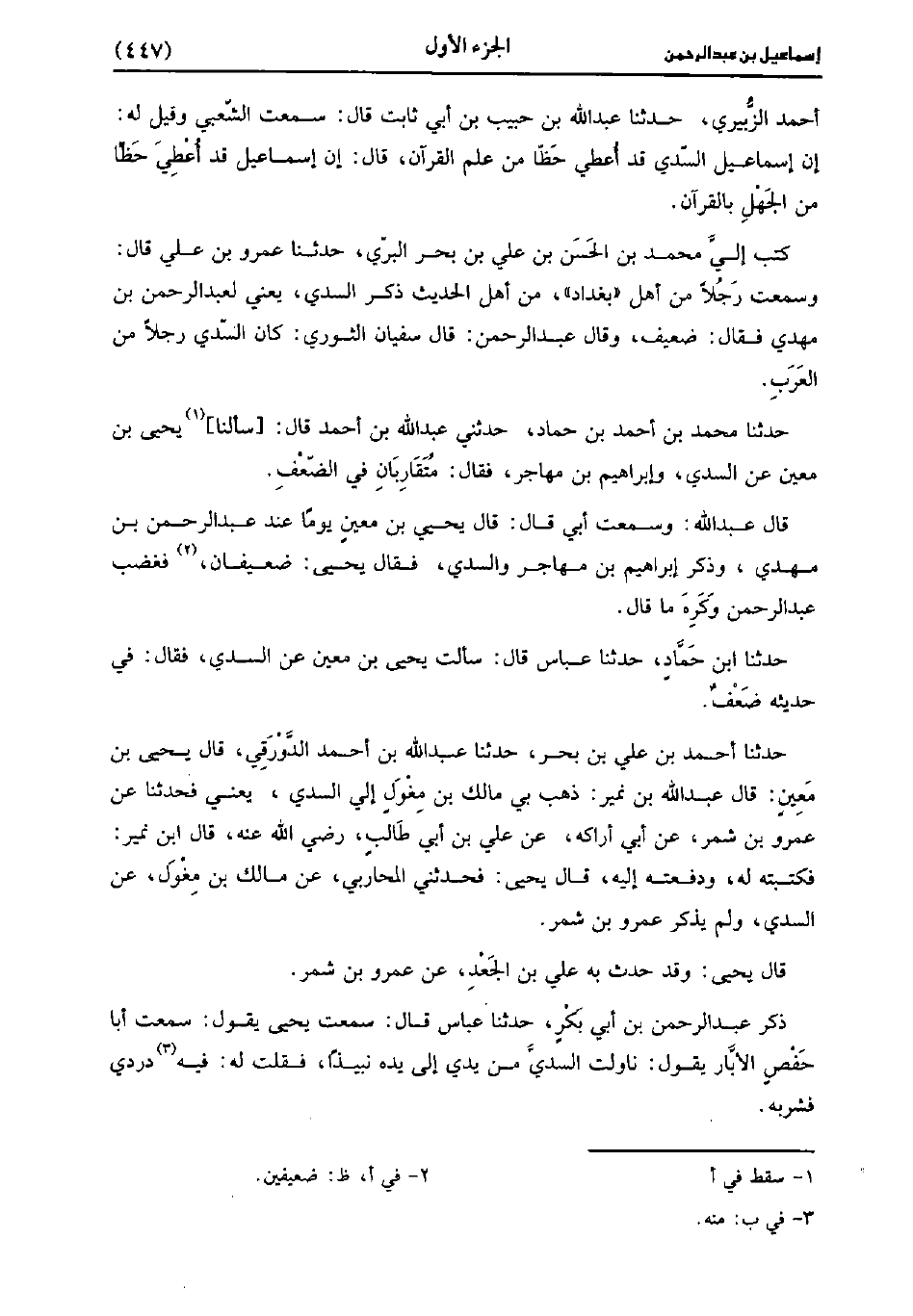 كَتَبَ إِلَيَّ مُحَمد بْنُ الْحَسَنِ بْنِ عَلِيِّ بْنِ بَحْرٍ الْبُرِّيُّ، حَدَّثَنا عَمْرو بن علي قال: وسمعتُ رجلا من أهل بغداد من أهل الحديث ذكر السدي، يعني لعبد الرحمن بن مهدي فقال: ضعيف، وقال عَبد الرحمن: قال سفيان الثَّوْريّ: كان السدي رجلا من العرب.