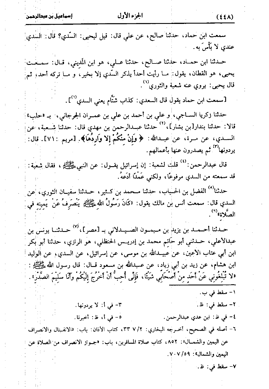 قال عَبد الرحمن: قلت لشعبة: إن إسرائيل يقول: عن النَّبِيُّ صَلَّى اللَّهُ عَلَيْهِ وَسَلَّمَ، فقال شُعْبَة: قد سمعته من السدي مرفوعا، ولكني عمدا أدعه.