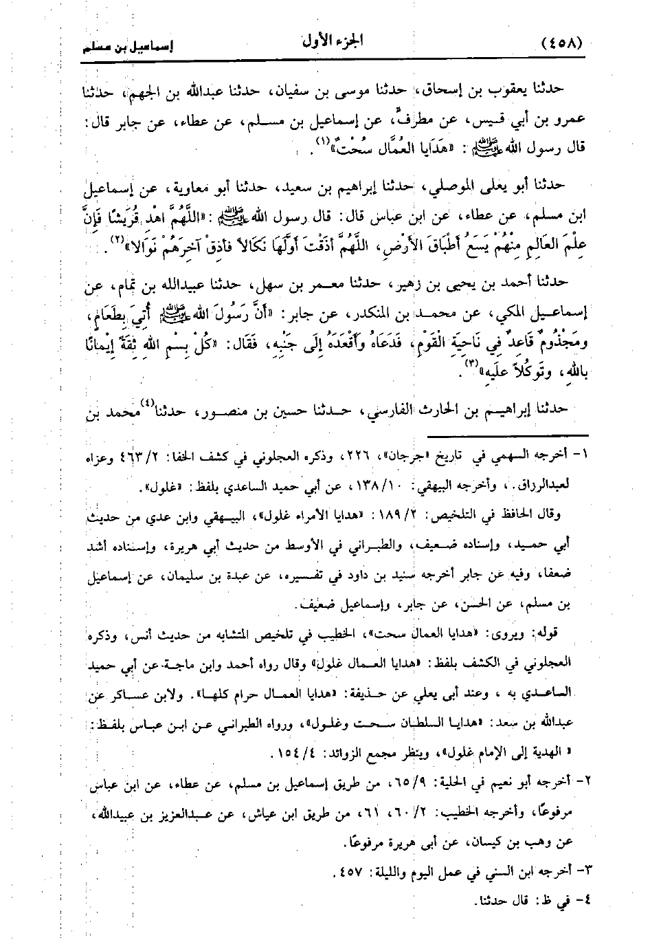حَدَّثَنَا يَعْقُوبُ بْنُ إِسْحَاقَ، حَدَّثَنا مُوسَى بْنُ سُفْيَانَ، حَدَّثَنا عَبد اللَّهِ بْنُ الْجَهْمِ، حَدَّثَنا عَمْرو بْنُ أَبِي قَيْسٍ، عَنْ مُطَرِّفٍ، عَنْ إِسْمَاعِيلَ بْنِ مُسْلِمٍ، عَنْ عَطاء، عَن جَابِرِ، قَال: قَال رَسُولِ اللَّهِ صَلَّى اللَّهُ عَلَيْهِ وَسَلَّمَ: هَدَايَا الْعُمَّالِ سُحْتٌ.