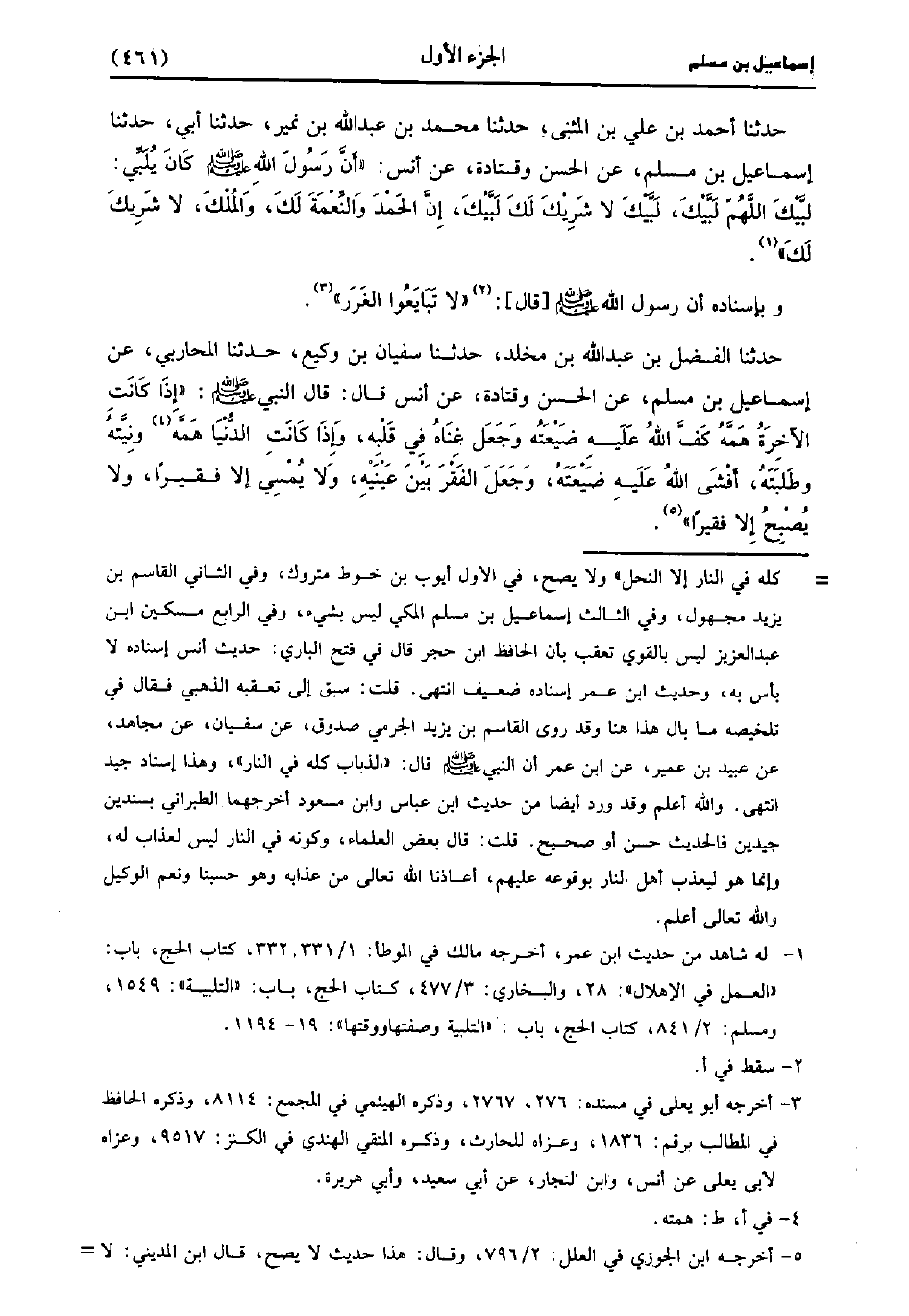 حَدَّثَنَا أَحْمَدُ بْنُ عَلِيِّ بْنِ الْمُثَنَّى، حَدَّثَنا مُحَمد بْنُ عَبد اللَّهِ بْنِ نُمَير، حَدَّثَنا أَبِي، حَدَّثَنا إِسْمَاعِيلُ بْنُ مُسْلِمٍ، عَنْ الْحَسَنِ، وَقَتَادَةَ، عَن أَنَس؛ أَن رسُول اللَّهِ صَلَّى اللَّهُ عَلَيْهِ وَسَلَّمَ كَانَ يُلَبِّي: لَبَّيْكَ اللَّهُمَّ لَبَّيْكَ، لَبَّيْكَ لا شَرِيكَ لَكَ لَبَّيْكَ، إِنَّ الْحَمْدَ وَالنِّعْمَةَ لَكَ وَالْمُلْكَ، لا شَرِيكَ لَكَ.