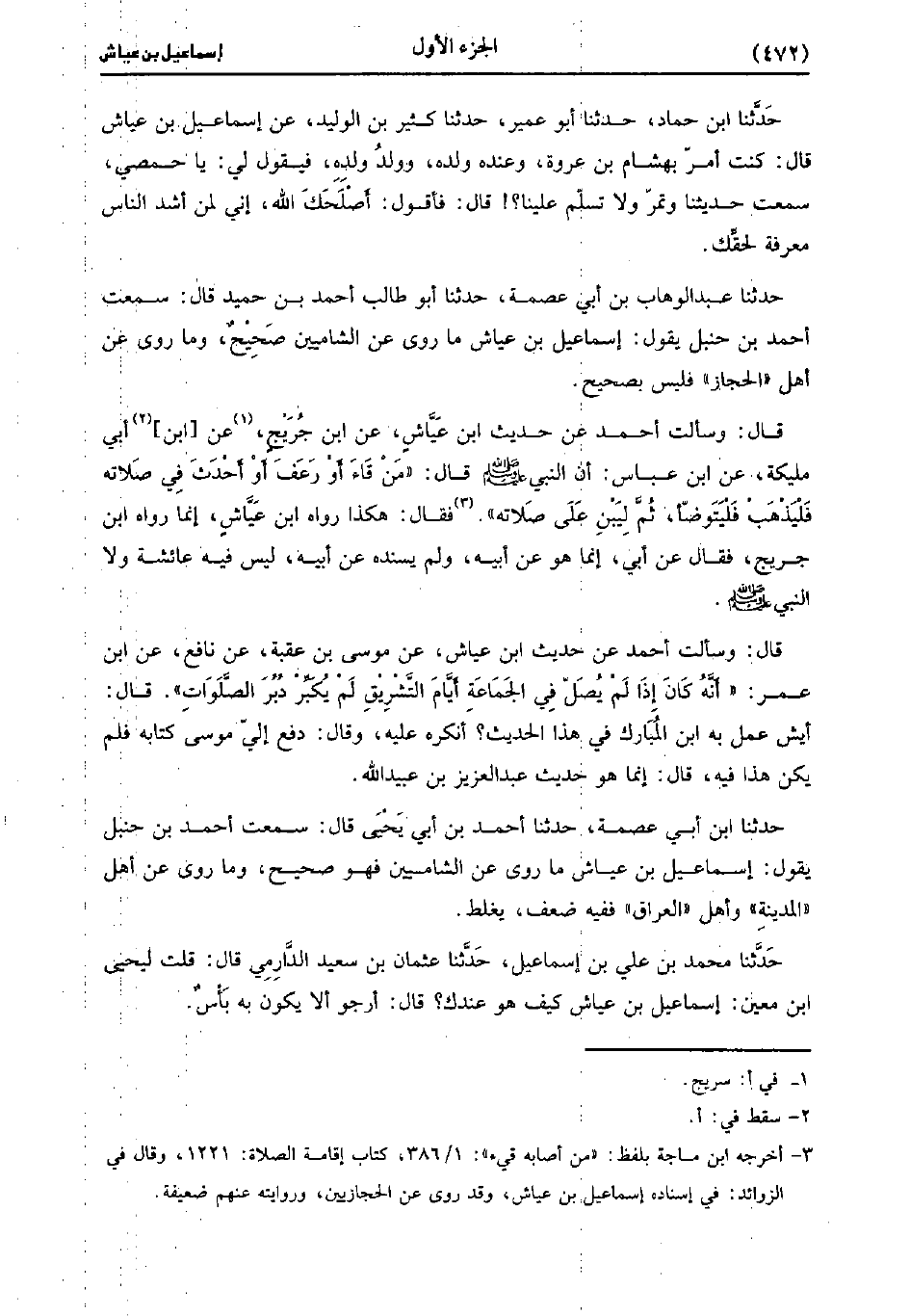 حَدَّثَنَا ابن أَبِي عِصْمَةَ، حَدَّثَنا أَحْمَدُ بْنُ أبي يَحْيى، قَالَ: سَمِعْتُ أحمد بن حنبل يقول: إسماعيل بن عياش ما روى عن الشاميين فهو صحيح وما روى عن أهل المدينة وأهل العراق ففيه ضعف يغلط.