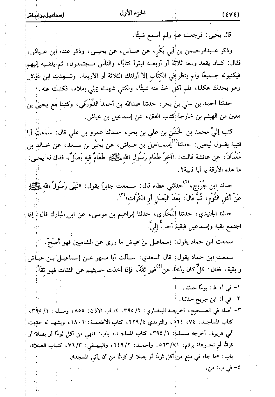 سمعتُ ابن حماد يقول: قال السعدي سألت أبا مسهر عن إسماعيل بن عياش وبقية فقال كل كان يأخذ من غير ثقة، فإذا أخذت حديثهم عن الثقات فهو ثقة.