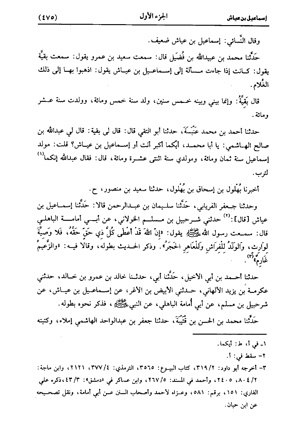 حَدَّثَنَا بُهْلُولُ بْنُ إِسْحَاقَ بْنُ بُهْلُولٍ، حَدَّثَنا سَعِيد بْنُ مَنْصُورٍ (ح) وَحَدَّثَنَا جَعْفَرٌ الْفِرْيَابِيُّ، حَدَّثَنا سُلَيْمَانُ بْنُ عَبد الرَّحْمَنِ، قَالا: حَدَّثَنا إِسْمَاعِيلُ بْنُ عَيَّاشٍ، قَال: حَدَّثني شُرَحْبِيلُ بْنُ مُسْلِمٍ الْخَوْلانِيُّ، عَن أَبِي أُمَامَةَ الْبَاهِلِيِّ، قَالَ: سَمِعْتُ رَسُولَ اللَّهِ صَلَّى اللَّهُ عَلَيْهِ وَسَلَّمَ يَقُولُ: إِنَّ اللَّهَ قَدْ أَعْطَى كُلَّ ذِي حَقٍّ حَقَّهُ، فَلا وَصِيَّةَ لِوَارِثٍ وَالْوَلَدُ لِلْفِرَاشِ، وَلِلْعَاهِرِ الْحَجَرُ، وَذَكَرَ الْحَدِيثَ بِطُولِهِ، وَقَالا فِيهِ: وَالزَّعِيمُ غَارِمٌ.