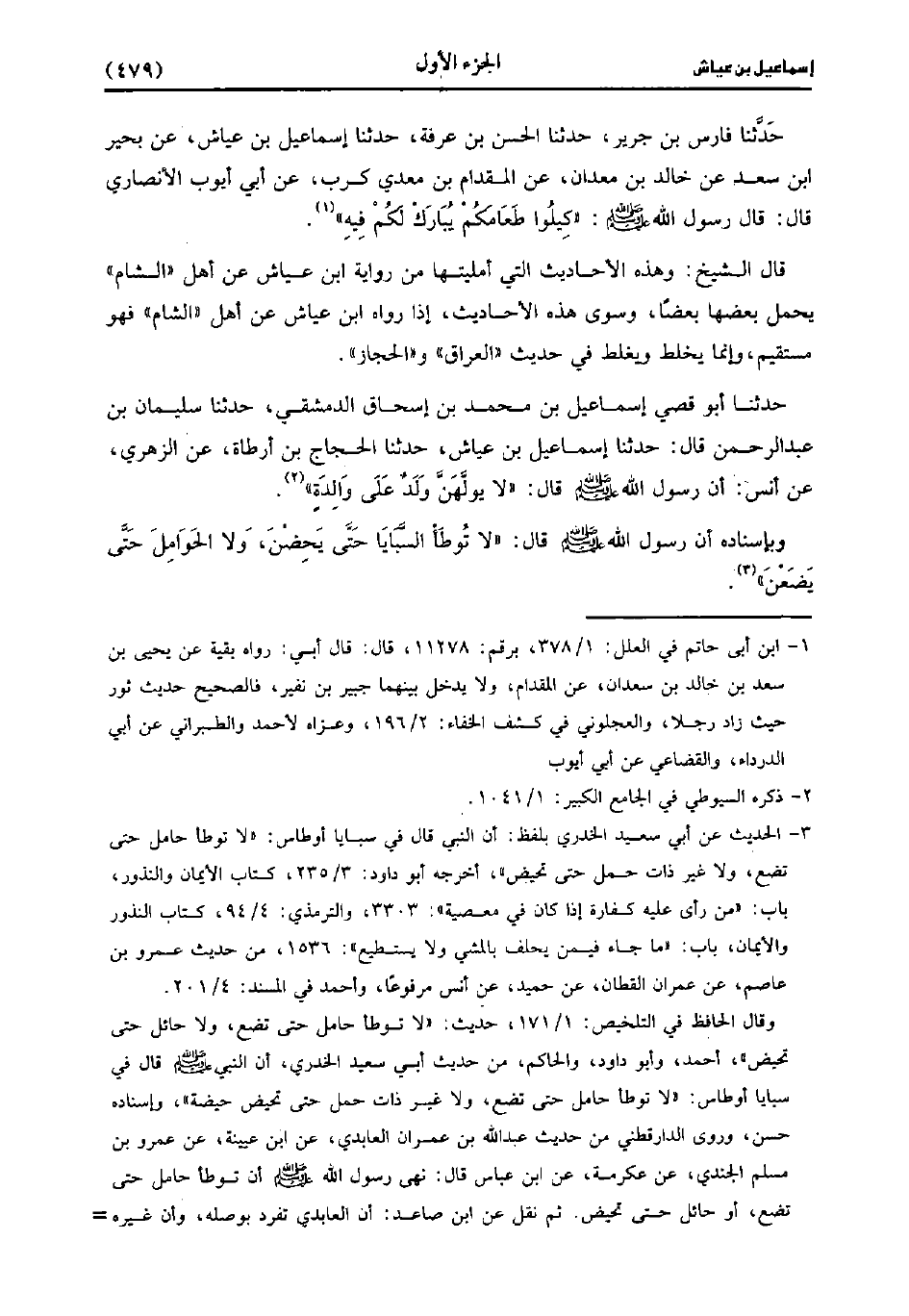 - وَبِإِسْنَادِهِ؛ أَنَّ رَسُولَ اللَّهِ صَلَّى اللَّهُ عَلَيْهِ وَسَلَّمَ صَلَّى اللَّهُ عَلَيه وسَلَّم قَال: لا تُوطَأُ السَّبَايَا حَتَّى يَحِضْنَ، ولاَ الحوامل حتى يضعن.