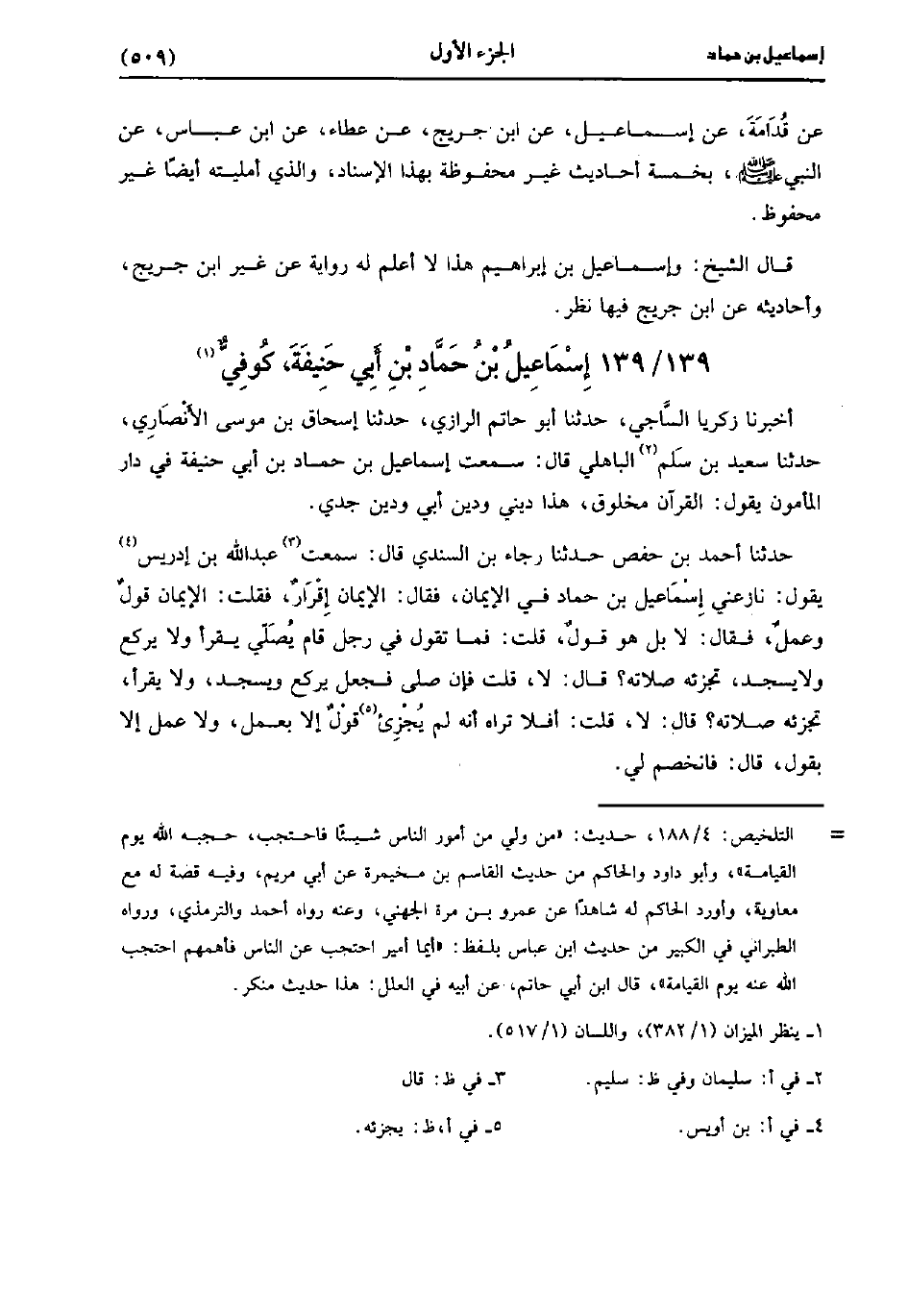 حَدَّثَنَا أحمد بن حفص، حَدَّثَنا رجاء بن السندي، سمعت عَبْدَ اللَّهِ بْنَ إِدْرِيسَ يَقُولُ: نازعني إسماعيل بن حماد في الإيمان، فقال: الإيمان إقرار، فقلت: الإيمان قول وعمل؟ فقال: لاَ، بل هو قول، قلت: فما تقول في رجل قام يصلي يقرأ، ولاَ يركع ولاَ يسجد، تجزئه صلاته؟ قَال: لاَ، قلت: فإن صلى فجعل يركع ويسجد، ولاَ يقرأ، تجزئه صلاته؟ قَال: لاَ، قلت: أفلا تراه أنه لم يجزئ قول إلا بعمل، ولاَ عمل إلا بقول؟ قال: فانخصم لي.
