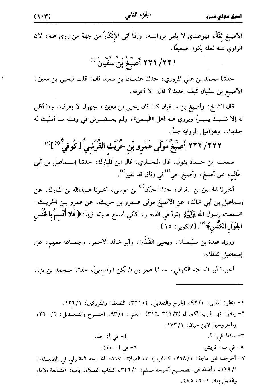 حَدَّثَنَا الْحُسَيْنُ بْنُ سُفْيَانَ، حَدَّثَنا حِبَّانُ بْنُ مُوسَى، أَخْبَرنا عَبد اللَّهِ بْنُ المُبَارك عَنْ إِسْمَاعِيلَ بْنِ أَبِي خَالِدٍ عَنِ الأَصْبَغِ مَوْلَى عَمْرو بْنِ حُرَيْثٍ عَنْ عَمْرو بْنِ الْحُرَيْثِ سَمِعْتُ رَسُولَ اللَّهِ صَلَّى اللَّهُ عَلَيْهِ وَسَلَّمَ يَقْرَأُ فِي الْفَجْرِ كَأَنِّي أَسْمَعُ صَوْتَهُ فِيهَا فَلا أُقْسِمُ بِالْخُنَّسِ الجوار الكنس.