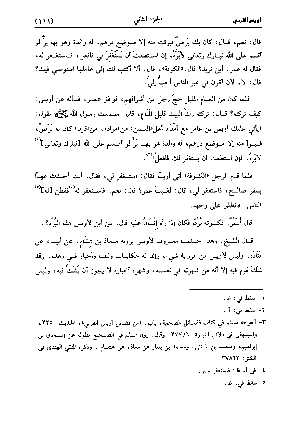 قَالَ نَعَمْ، قَال: كَانَ بِكَ برص فبرات مِنْهُ إِلا مَوْضِعَ دِرْهَمٍ وَلَهُ والدة، وَهو بها بار لَوْ أَقْسَمَ عَلَى اللَّهِ تَبَارَكَ وَتَعَالَى لأَبَرَّهُ إِنِ اسْتَطَعْتَ أَنْ تَسْتَغْفِرَ لِي فَافْعَلْ فَاسْتَغْفَرَ لَهُ فَقَالَ لَهُ عُمَر أَيْنَ تُرِيدُ قَالَ الْكُوفَةُ قَالَ أَلا أَكْتُبُ لك إلى عاملها ليستوصي فِيكَ؟ قَال: لاَ لأَنْ أَكُونَ فِي غُبَّرِ النَّاسِ أَحَبُّ إِلَيَّ.