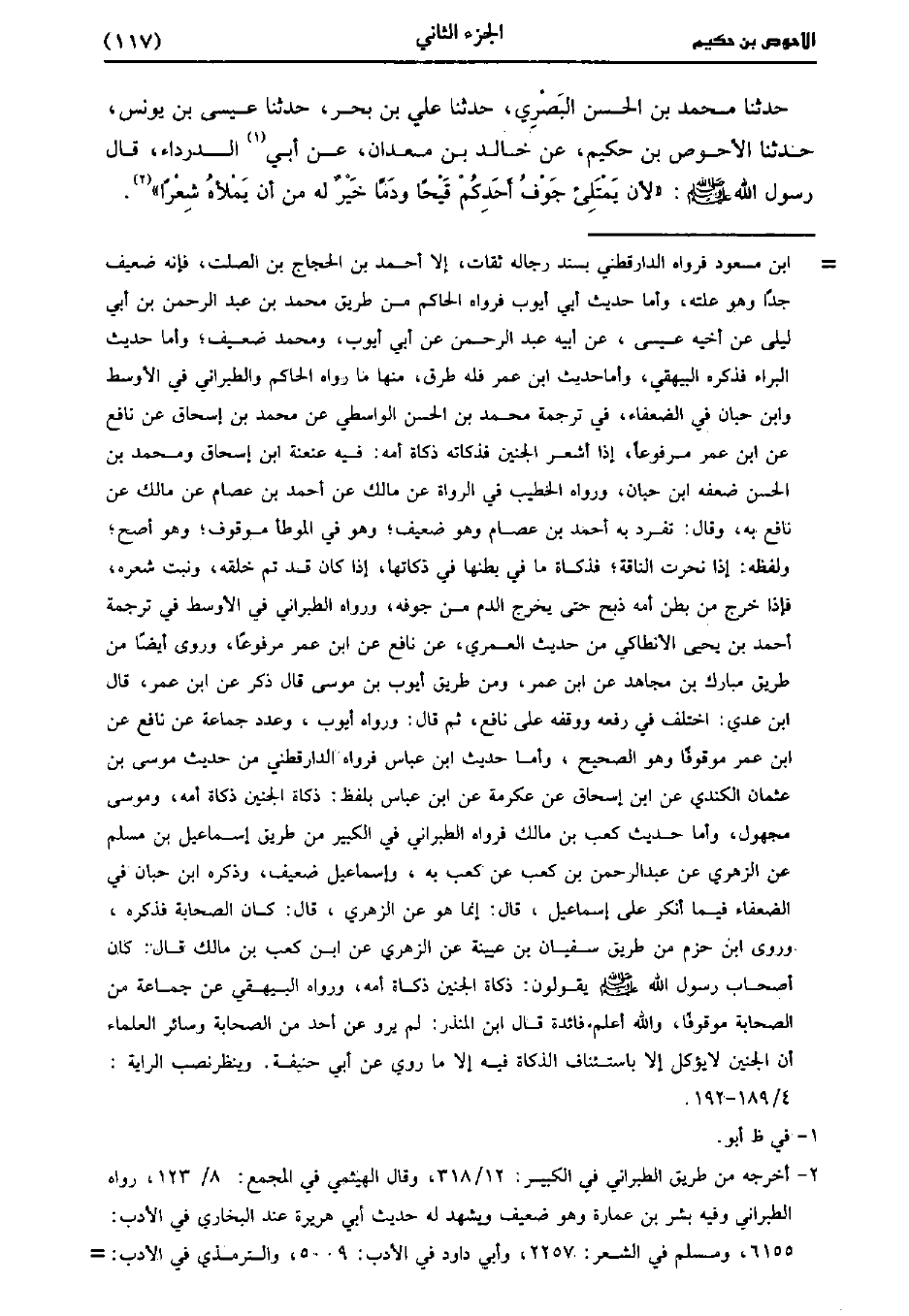 حَدَّثَنَا مُحَمد بْنُ الْحَسَنِ الْبَصْرِيُّ، حَدَّثَنا عَلِيُّ بْنُ بَحْرٍ، حَدَّثَنا عِيسَى بْنُ يُونُس، حَدَّثَنا الأَحَوْصُ بْنِ حَكِيمٍ عَنْ خَالِدِ بْنِ مَعْدَانَ، عَن أَبِي الدَّرْدَاءِ قَال رَسُول اللهِ صَلَّى اللَّهُ عَلَيهِ وَسلَّمَ لأن يمتلىء جَوْفُ أَحَدِكُمْ قَيْحًا وَدَمًا خَيْرٌ لَهُ مِنْ أَنْ يَمْلأَهُ شِعْرًا