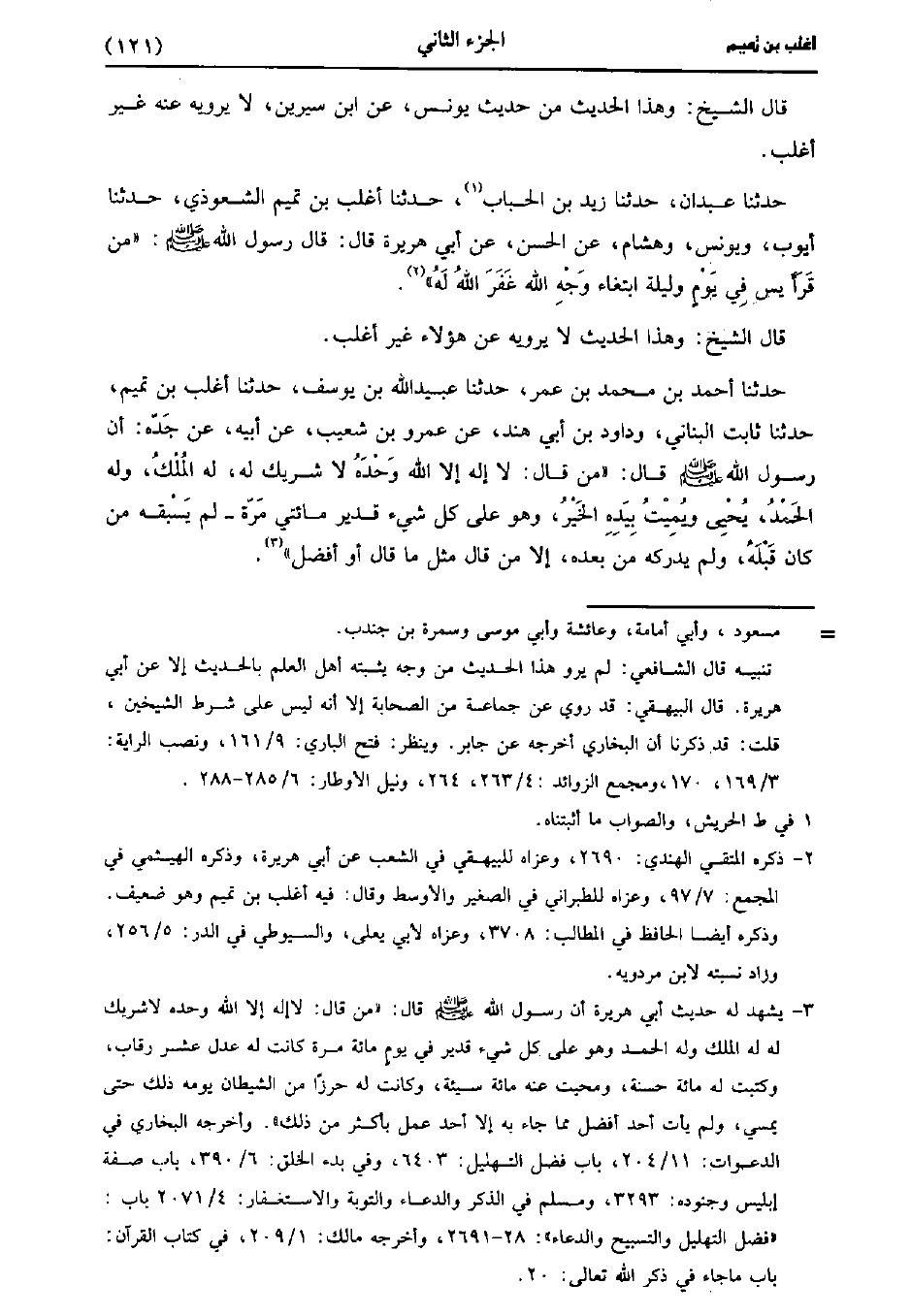 حَدَّثَنَا أَحْمَدُ بْنُ مُحَمد بْنِ عُمَر، حَدَّثَنا عُبَيد اللَّهِ بْنُ يُوسُفَ، حَدَّثَنا أَغْلَبُ بْنُ تَمِيمٍ، حَدَّثَنا ثَابِتٌ الْبُنَانِيُّ وَدَاوُدُ بْنُ أَبِي هِنْدٍ عَنْ عَمْرو بْنِ شُعَيب، عَنْ أَبِيهِ، عَن جَدِّهِ، أَن رسُول اللَّهِ صَلَّى اللَّهُ عَلَيه وسَلَّم قَال: مَن قَال لا إِلَهَ إِلا اللَّهُ وَحْدَهُ لا شَرِيك لَهُ لَهُ الْمُلْكُ وَلَهُ الْحَمْدُ يُحْيِي وَيُمِيتُ بِيَدِهِ الْخَيْرُ، وَهو عَلَى كُلِّ شَيْءٍ قَدِيرٌ مئتي مَرَّةٍ لَمْ يَسْبِقْهُ مَنْ كَانَ قَبْلَهُ وَلَمْ يُدْرِكْهُ مَنْ بَعْدَهُ إلاَّ مَن قَال مِثْلَ مَا قال أو أفضل