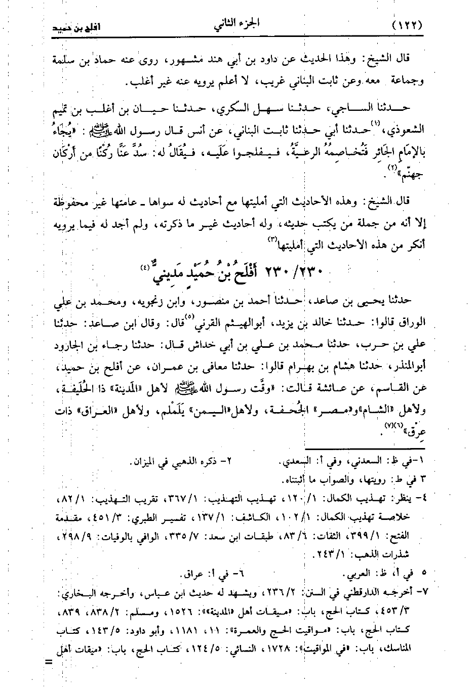 حَدَّثَنَا يَحْيى ابْنُ صَاعِدٍ، حَدَّثَنا أَحْمَدُ بْنُ مَنْصُورٍ، وَابْنُ زَنْجَوَيْهِ، وَمُحمد بْنُ عَلِيٍّ الْوَرَّاقُ قَالُوا، حَدَّثَنا خَالِدُ بْنُ يَزِيدَ أَبُو الْهَيْثَمِ الْقُرَنِيُّ قَالَ وَقَالَ ابْنُ صَاعِدٍ، حَدَّثَنا عَلِيُّ بْنُ حَرْبٍ، حَدَّثَنا مُحَمد بْنُ عَلِيِّ بْنِ أَبِي خِدَاشٍ، قَال: حَدَّثَنا رَجَاءُ بْنُ الْجَارُودِ أَبُو الْمُنْذِرِ، حَدَّثَنا هِشَامُ بْنُ بَهْرَامٍ قَالُوا، حَدَّثَنا مُعَافَى بْنُ عِمْرَانَ عَنْ أَفْلَحَ بْنِ حُمَيْدٍ، عَنِ الْقَاسِمِ، عَن عَائِشَةَ قَالَتْ وَقَّتَ رَسُولُ اللَّهِ صَلَّى اللَّهُ عَلَيْهِ وَسَلَّمَ لأَهْلِ الْمَدِينَةِ ذَا الْحُلَيْفَةِ وَلأَهْلِ الشَّامِ وَمِصْرَ الْجُحْفَةَ ولأهل اليمن يلملم ولأهل للعراق ذات عرق