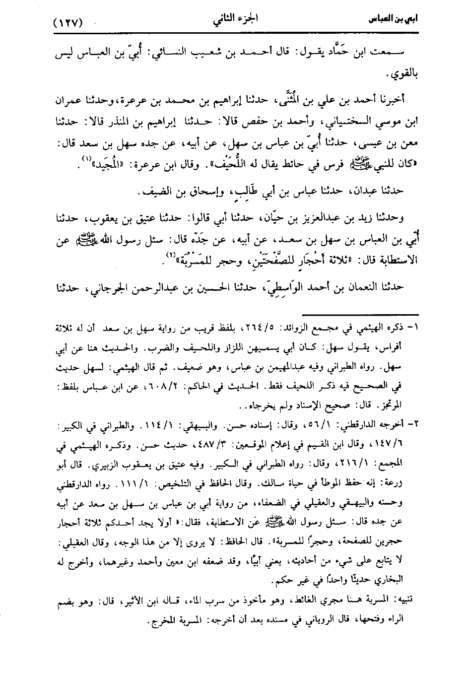 حَدَّثَنَا أَحْمَدُ بْنُ عَلِيِّ بْنِ الْمُثَنَّى، حَدَّثَنا إِبْرَاهِيمُ بْنُ مُحَمد بْنِ عَرْعَرَةَ وَحَدَّثَنَا عِمْرَانُ بْنُ مُوسَى السِّخْتِيَانِيُّ وَأَحْمَدُ بْنُ حَفْصٍ، قَالا: حَدَّثَنا إِبْرَاهِيمُ بْنُ الْمُنْذِرِ، قَالا: حَدَّثَنا مَعْنُ بْنُ عِيسَى، حَدَّثَنا أُبَيُّ بْنُ عَبَّاسِ بْنِ سَهْلٍ، عَنْ أَبِيهِ، عَن جَدِّهِ سَهْلِ بْنِ سَعْدٍ، قَال: كَانَ لِلنَّبِيِّ صَلَّى اللَّهُ عَلَيهِ وَسلَّمَ فَرَسٌ فِي حَائِطٍ، يُقَال لَهُ: اللُّحَيْفُ وَقَالَ ابْنُ عَرْعَرَةَ الْمُجَيْدُ.