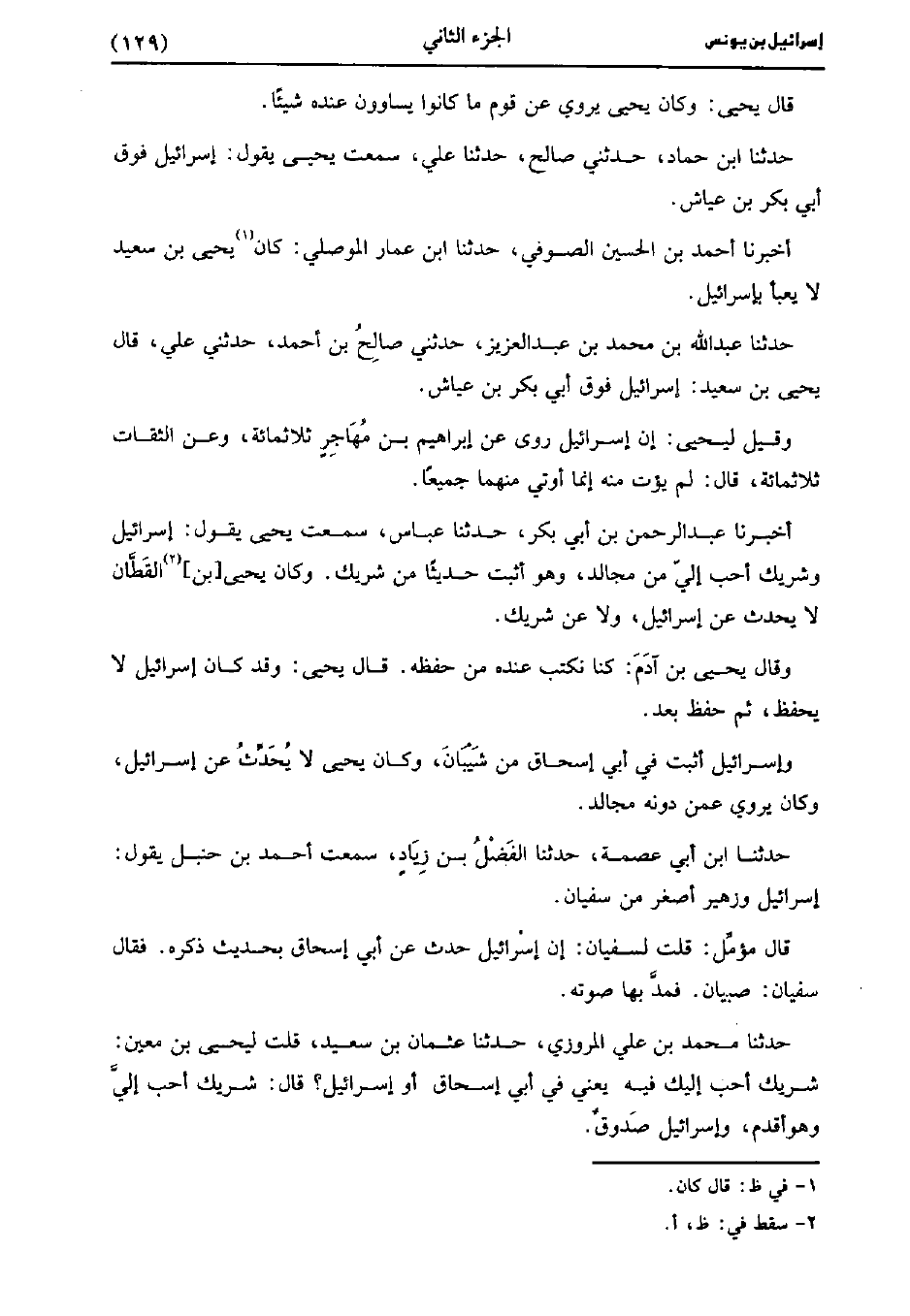 وإسرائيل أثبت فِي أَبِي إِسْحَاق من شيبان وَكَانَ يَحْيى لا يحدث عَن إسرائيل وَكَانَ يروي عَمَّن دونه مجالد.